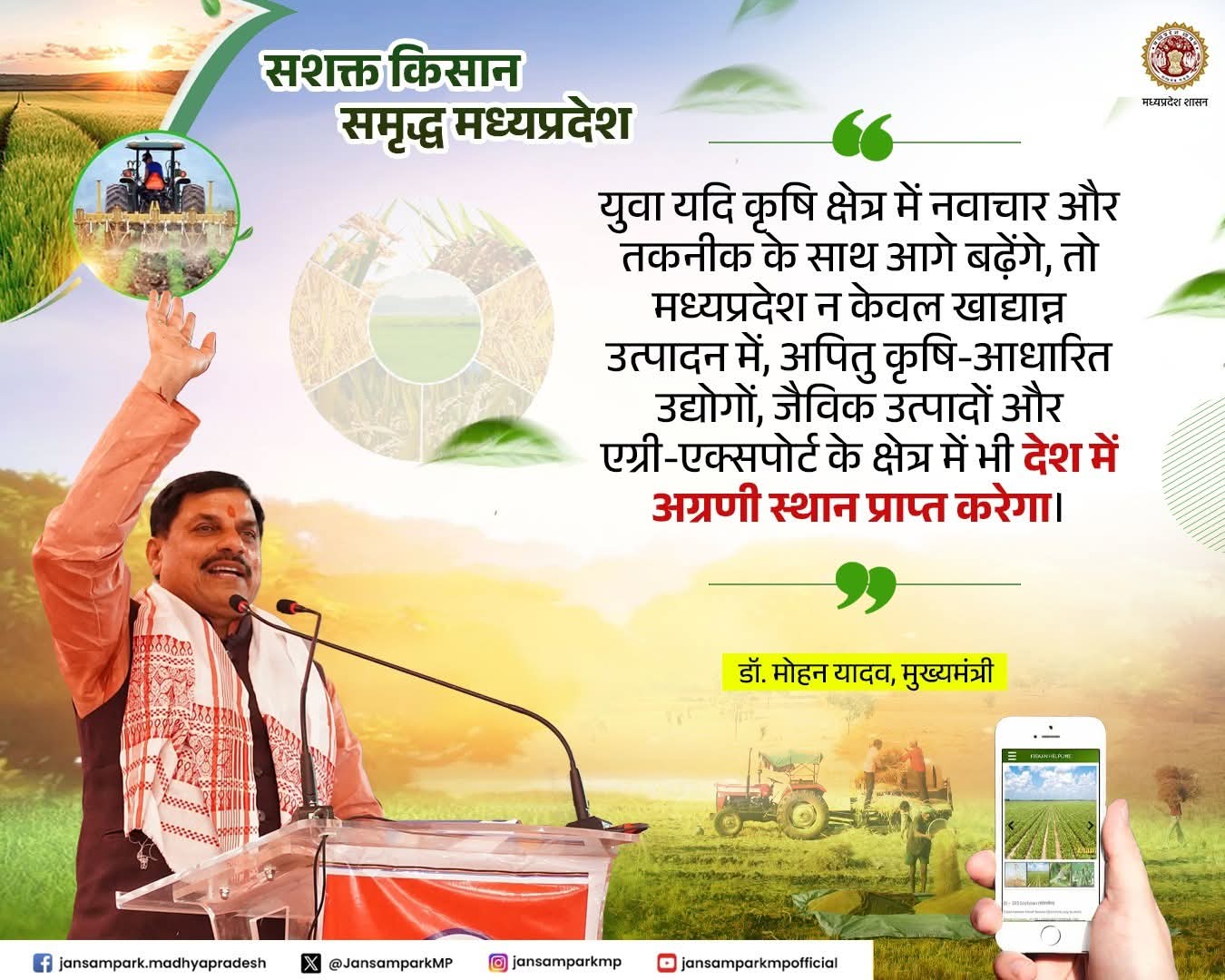 युवा यदि कृषि क्षेत्र में नवाचार और तकनीक के साथ आगे बढ़ेंगे, तो मध्यप्रदेश न केवल खाद्यान्न उत्पादन में, अपितु कृषि-आधारित उद्योगों, जैविक उत्पादों और एग्री-एक्सपोर्ट के क्षेत्र में भी देश में अग्रणी स्थान प्राप्त करेगा।