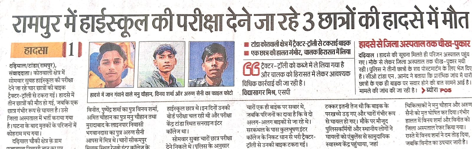 हाई स्कूल की परीक्षा देने जा रहे तीन छात्रों की मौत