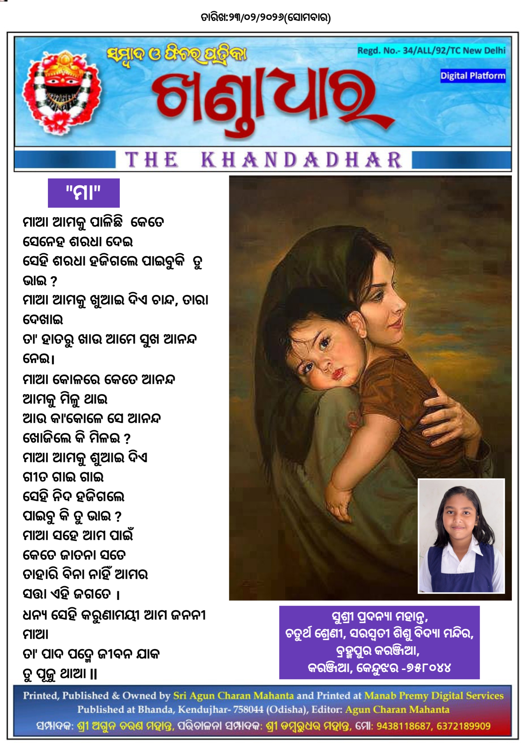 ସୁଶ୍ରୀ ପ୍ରଦନ୍ୟା ମହାନ୍ତ,ଚତୁର୍ଥ ଶ୍ରେଣୀ, ସରସ୍ବତୀ ଶିଶୁ ବିଦ୍ୟା ମନ୍ଦିର, ବ୍ରହ୍ମପୁର କରଞ୍ଜିଆ, କରଞ୍ଜିଆ, କେନ୍ଦୁଝର -୭୫୮୦୪୪