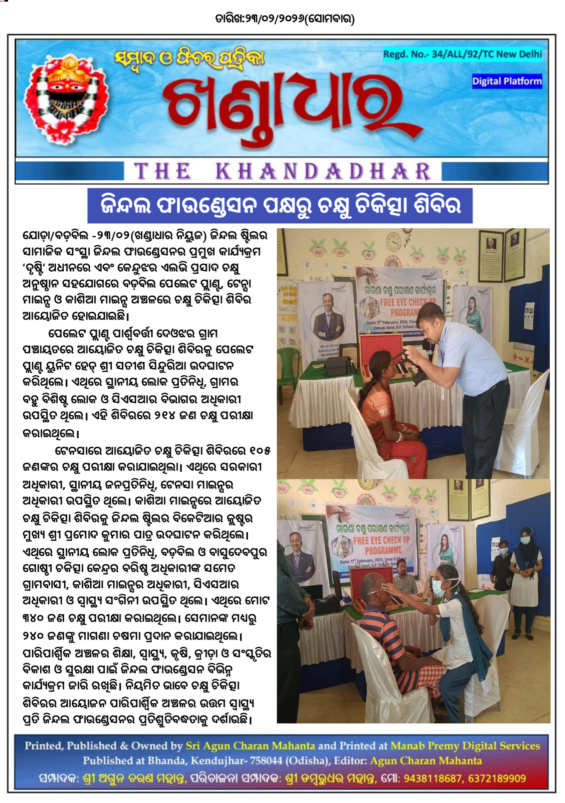 ଯୋଡ଼ା/ବଡ଼ବିଲ -୨୩/୦୨(ଖଣ୍ଡାଧାର ନିୟୁଜ) ଜିନ୍ଦଲ ଷ୍ଟିଲର ସାମାଜିକ ସଂସ୍ଥା ଜିନ୍ଦଲ ଫାଉଣ୍ଡେସନର ପ୍ରମୁଖ କାର୍ଯ୍ୟକ୍ରମ ‘ଦୃଷ୍ଟି’ ଅଧୀନରେ ଏବଂ କେନ୍ଦୁଝର ଏଲଭି ପ୍ରସାଦ ଚକ୍ଷୁ ଅନୁଷ୍ଠାନ ସହଯୋଗରେ ବଡ଼ବିଲ ପେଲେଟ ପ୍ଲାଣ୍ଟ, ଟେନ୍ସା ମାଇନ୍ସ ଓ କାଶିଆ ମାଇନ୍ସ ଅଞ୍ଚଳରେ ଚକ୍ଷୁ ଚିକିତ୍ସା ଶିବିର ଆୟୋଜିତ ହୋଇଯାଇଛି।