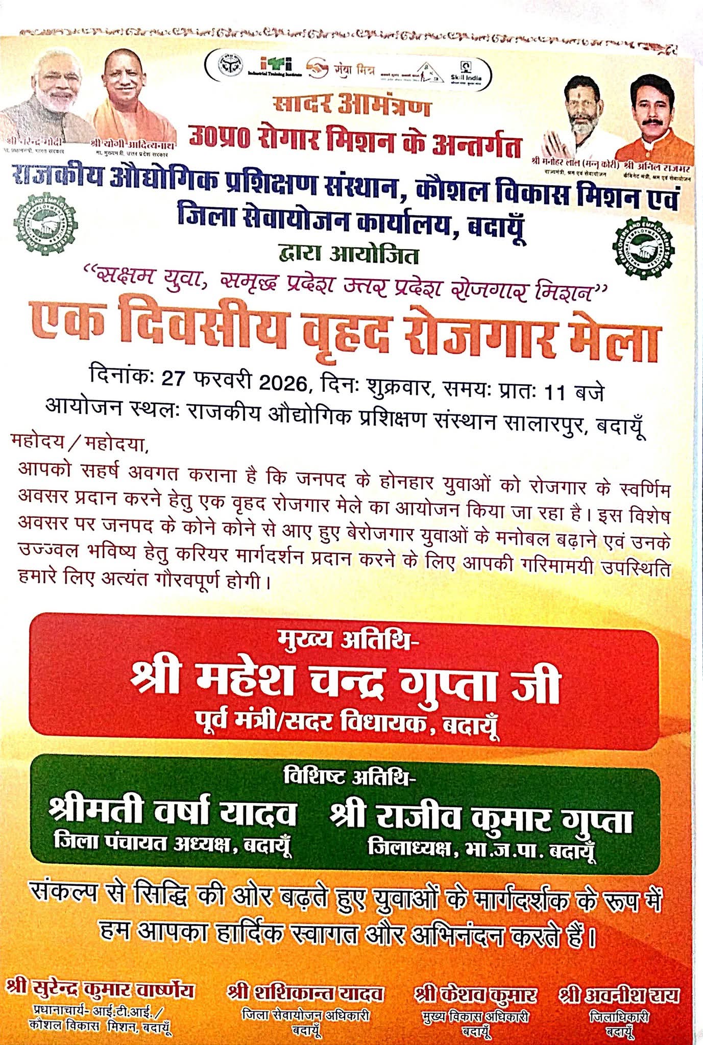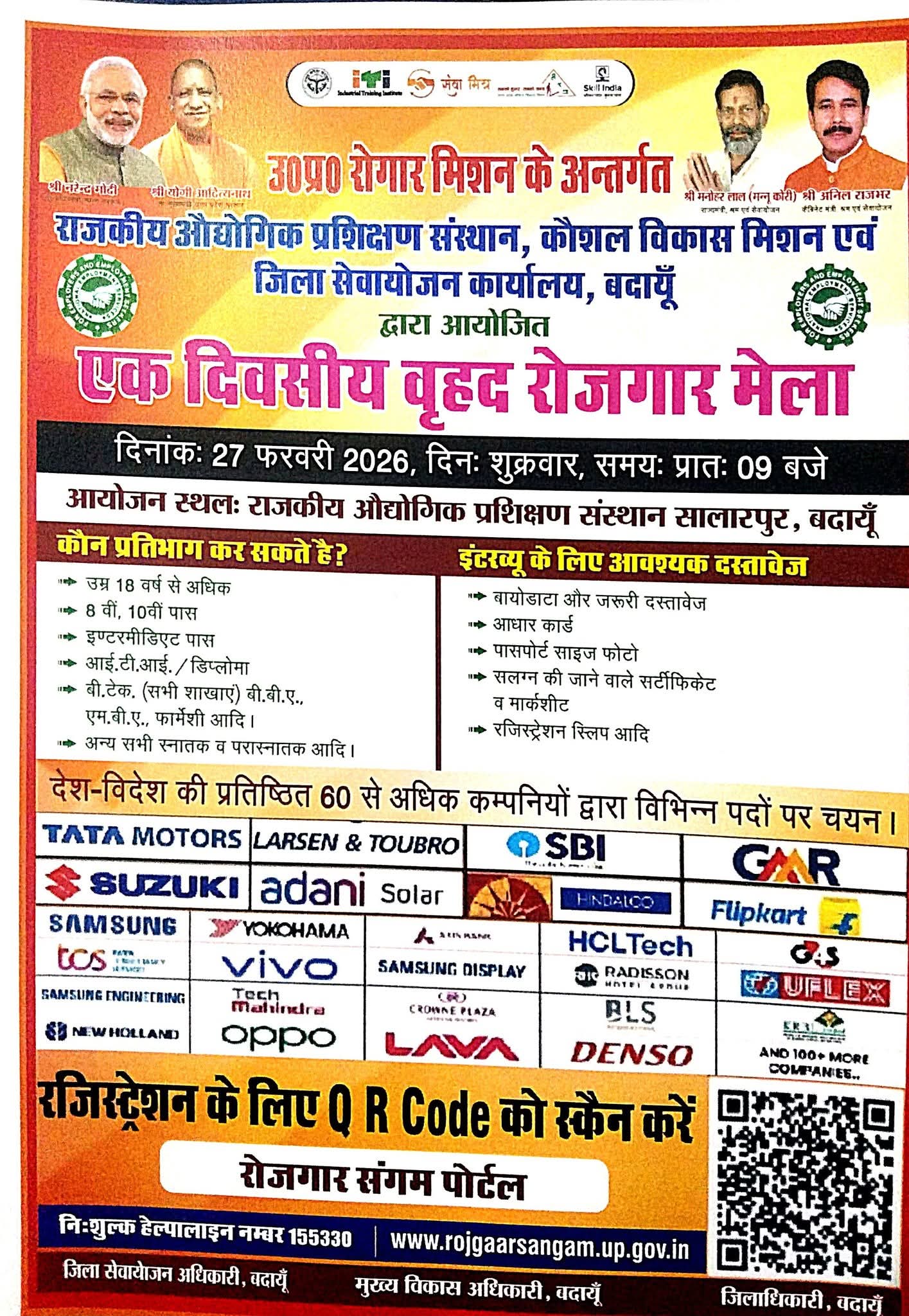 बदायूँ। युवाओं को रोजगार के बेहतर अवसर उपलब्ध कराने के उद्देश्य से 27 फरवरी 2026 (शुक्रवार) को राजकीय औद्योगिक प्रशिक्षण संस्थान, सालारपुर में एक दिवसीय वृहद रोजगार मेले का आयोजन किया जाएगा। यह मेला उत्तर प्रदेश रोजगार मिशन के अंतर्गत जिला सेवायोजन कार्यालय, कौशल विकास मिशन एवं आईटीआई प्रशासन के संयुक्त तत्वावधान में आयोजित होगा। मेले का शुभारंभ प्रातः 11 बजे किया जाएगा, जबकि अभ्यर्थियों का पंजीकरण सुबह 9 बजे से प्रारंभ होगा। रोजगार मेले में 50 से अधिक प्रतिष्ठित कंपनियां प्रतिभाग कर विभिन्न पदों पर भर्ती करेंगी। इसमें हाईस्कूल से लेकर स्नातकोत्तर तक की योग्यता रखने वाले तथा 18 वर्ष से अधिक आयु के अभ्यर्थी भाग ले सकेंगे। अभ्यर्थियों को अपने समस्त शैक्षिक प्रमाण पत्रों की प्रतियां एवं कम से कम पांच बायोडाटा साथ लाने के निर्देश दिए गए हैं। कार्यक्रम में मुख्य अतिथि के रूप में महेश चन्द्र गुप्ता (पूर्व मंत्री एवं सदर विधायक, बदायूँ) उपस्थित रहेंगे। विशिष्ट अतिथियों में वर्षा यादव (जिला पंचायत अध्यक्ष) तथा राजीव कुमार गुप्ता (भाजपा जिलाध्यक्ष) शामिल होंगे। आयोजकों ने बताया कि इस रोजगार मेले का उद्देश्य जनपद के युवाओं को रोजगार के स्वर्णिम अवसर प्रदान करने के साथ-साथ उन्हें करियर मार्गदर्शन देना और आत्मनिर्भर बनने के लिए प्रेरित करना है। जनपद के सभी बेरोजगार एवं योग्य युवाओं से अधिक से अधिक संख्या में प्रतिभाग करने की अपील की गई है। संवाद