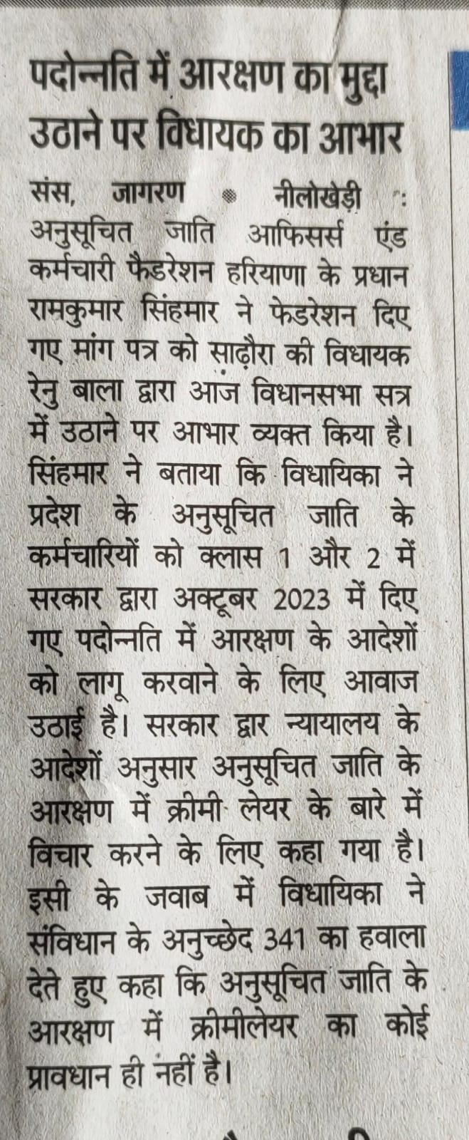 कपुरी :- साढौरा विधायक मैडम रेनू बाला जी ने हरियाणा विधानसभा के बजट सत्र के दौरान अनुसूचित जाति (SC) वर्ग के कर्मचारियों को पदोन्नति में आरक्षण देने का मुद्दा प्रमुखता से उठाया, उन्होंने सदन में कहा कि अनुसूचित जाति के कर्मचारियों को पदोन्नति में आरक्षण का प्रावधान लागू कर सामाजिक न्याय सुनिश्चित किया जाए, ताकि उन्हें प्रशासनिक और सरकारी सेवाओं में समान अवसर मिल सकें।