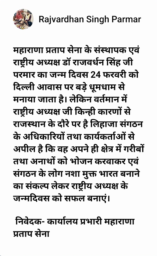महाराणा प्रताप सेना के संस्थापक एवं राष्ट्रीय अध्यक्ष डॉ. राजवर्धन सिंह परमार का जन्मदिवस प्रतिवर्ष 24 फरवरी को दिल्ली स्थित आवास पर हर्षोल्लास के साथ मनाया जाता है।