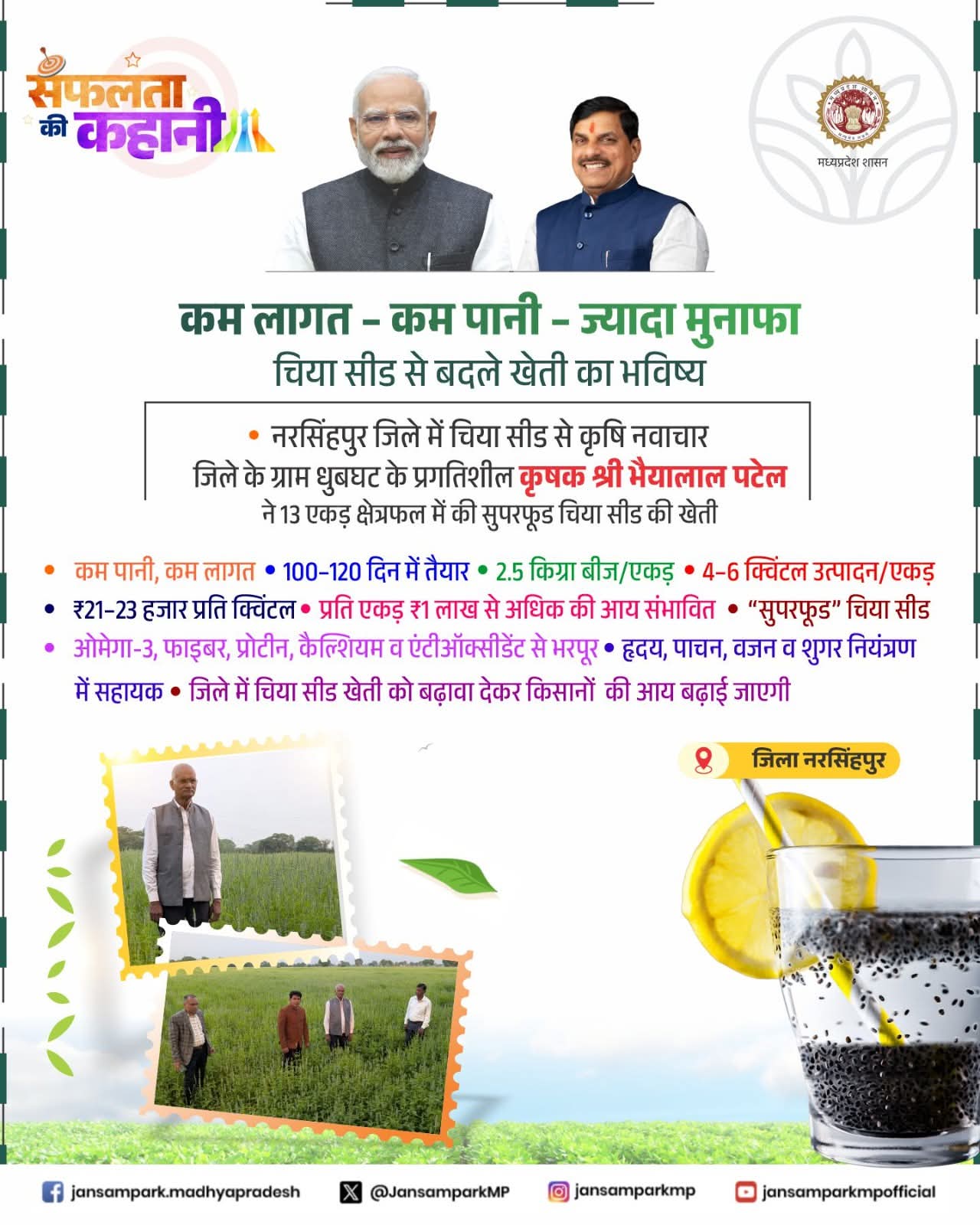 जिले ग्राम धुबघट के प्रगतिशील कृषक श्री भैयालाल पटेल ने 13 एकड़ में की सुपरफूड चिया सीड की खेती