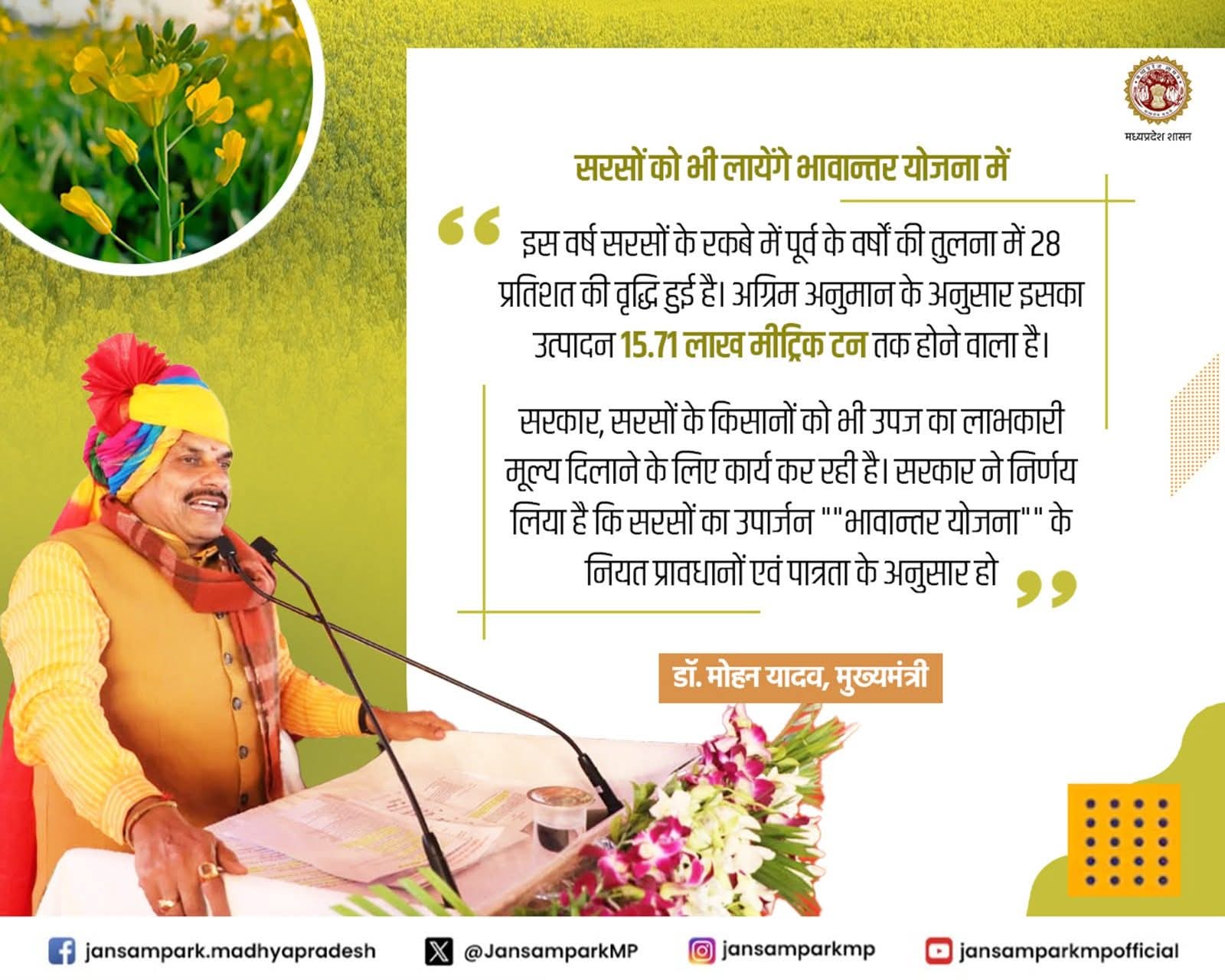 सरकार, सरसों के किसानों को भी उपज का लाभकारी मूल्य दिलाने के लिए कार्य कर रही है। सरकार ने निर्णय लिया है कि सरसों का उपार्जन "भावान्तर योजना" के नियत प्रावधानों एवं पात्रता के अनुसार हो