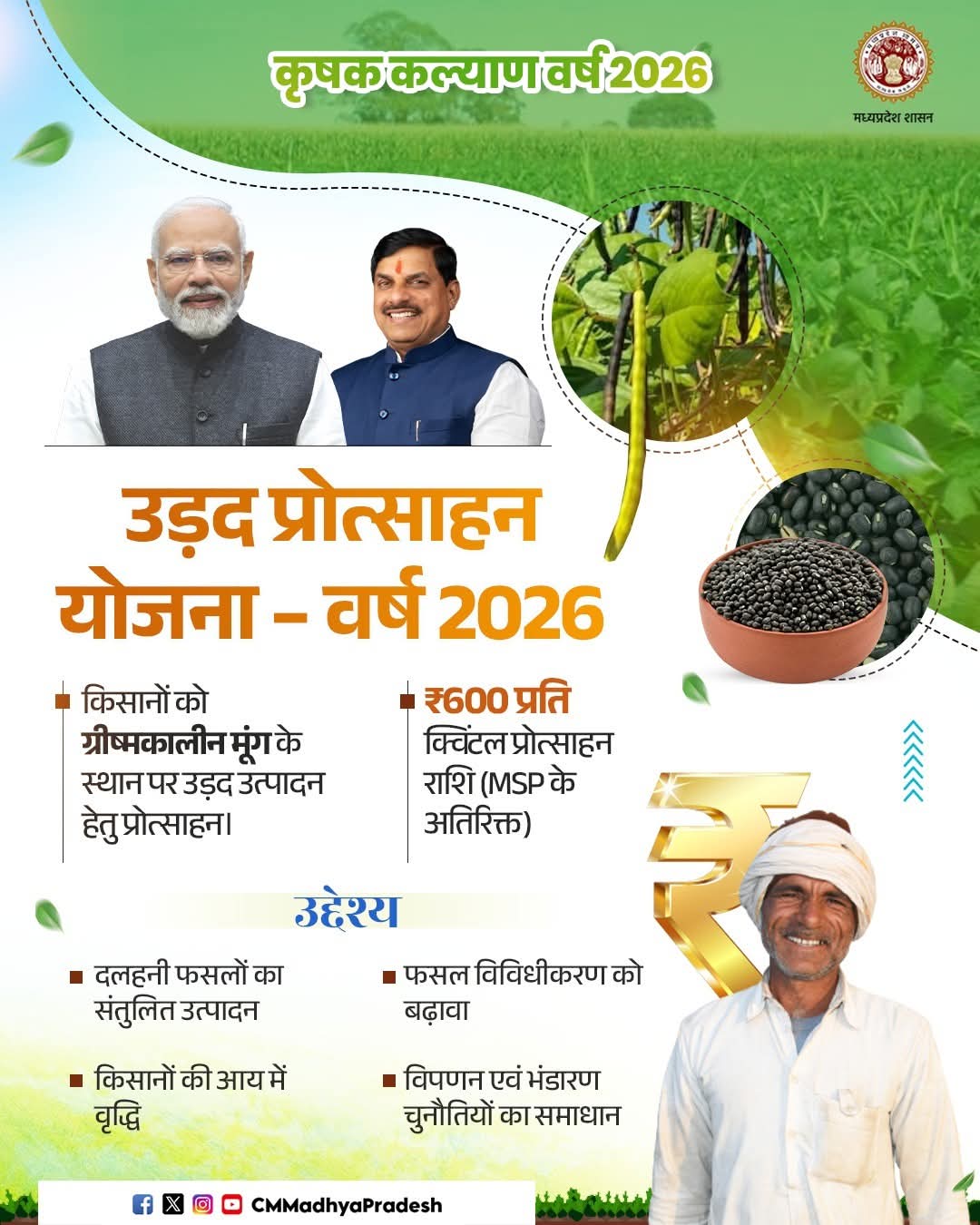 🌾 किसानों को उड़द उत्पादन के लिए ₹600 प्रति क्विंटल (MSP के अतिरिक्त) प्रोत्साहन राशि