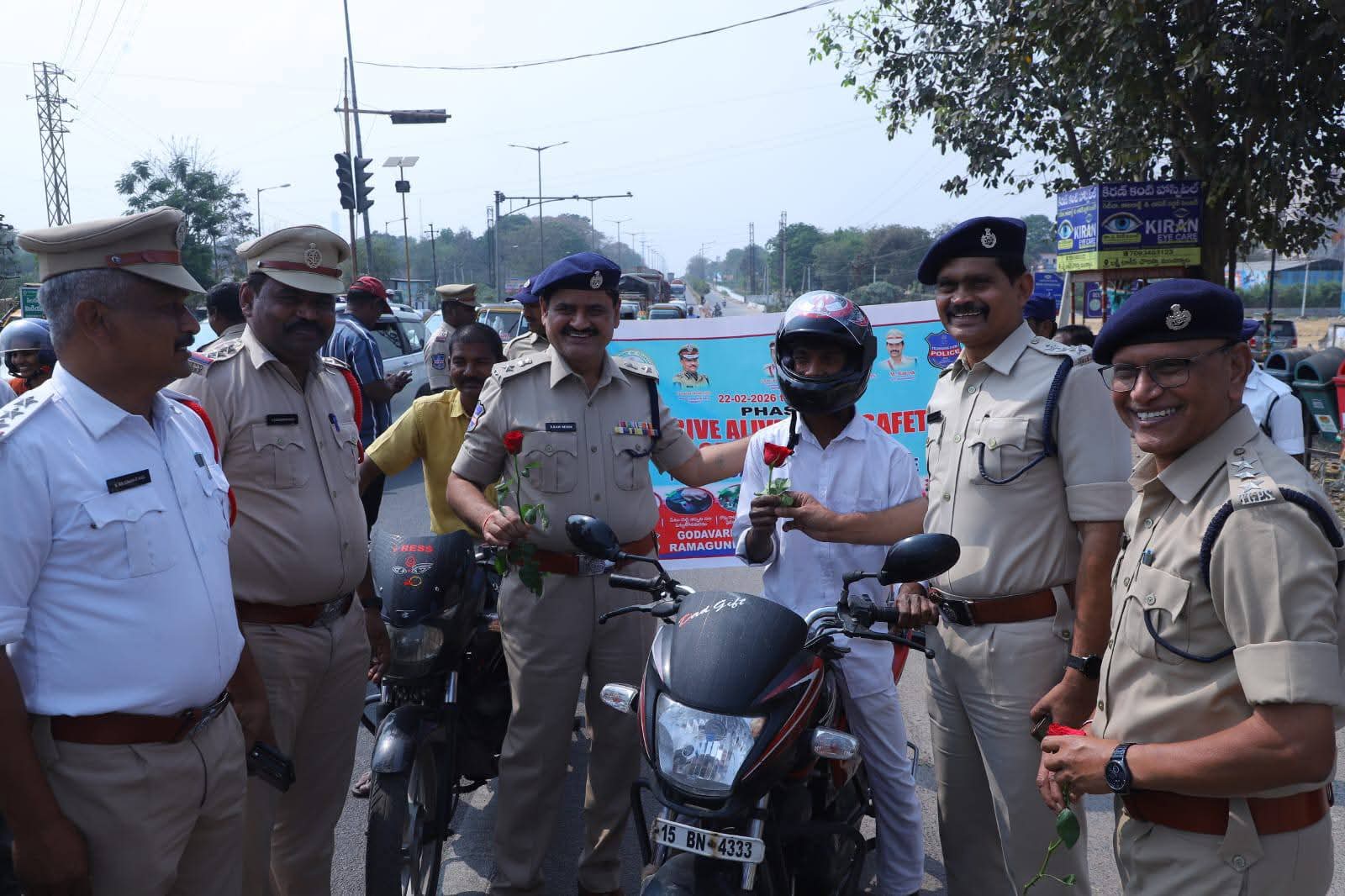 హెల్మెట్ ధరించిన వారికి పుష్పాలు… లేనివారికి హెల్మెట్ పంపిణీ.