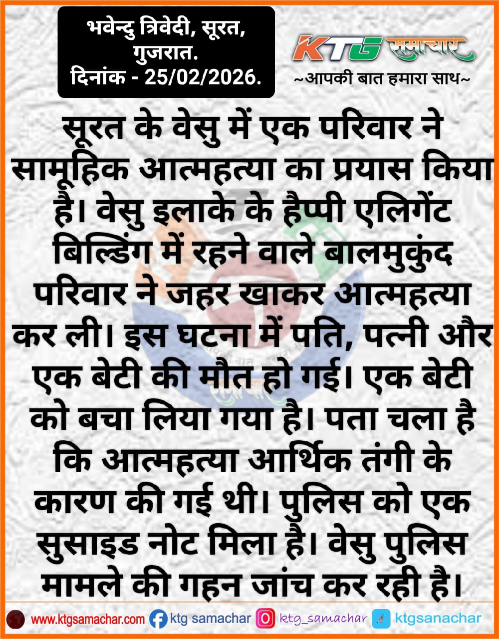 सूरत के वेसु मे एक परिवार ने सामूहिक आत्महत्या का प्रयास किया है।