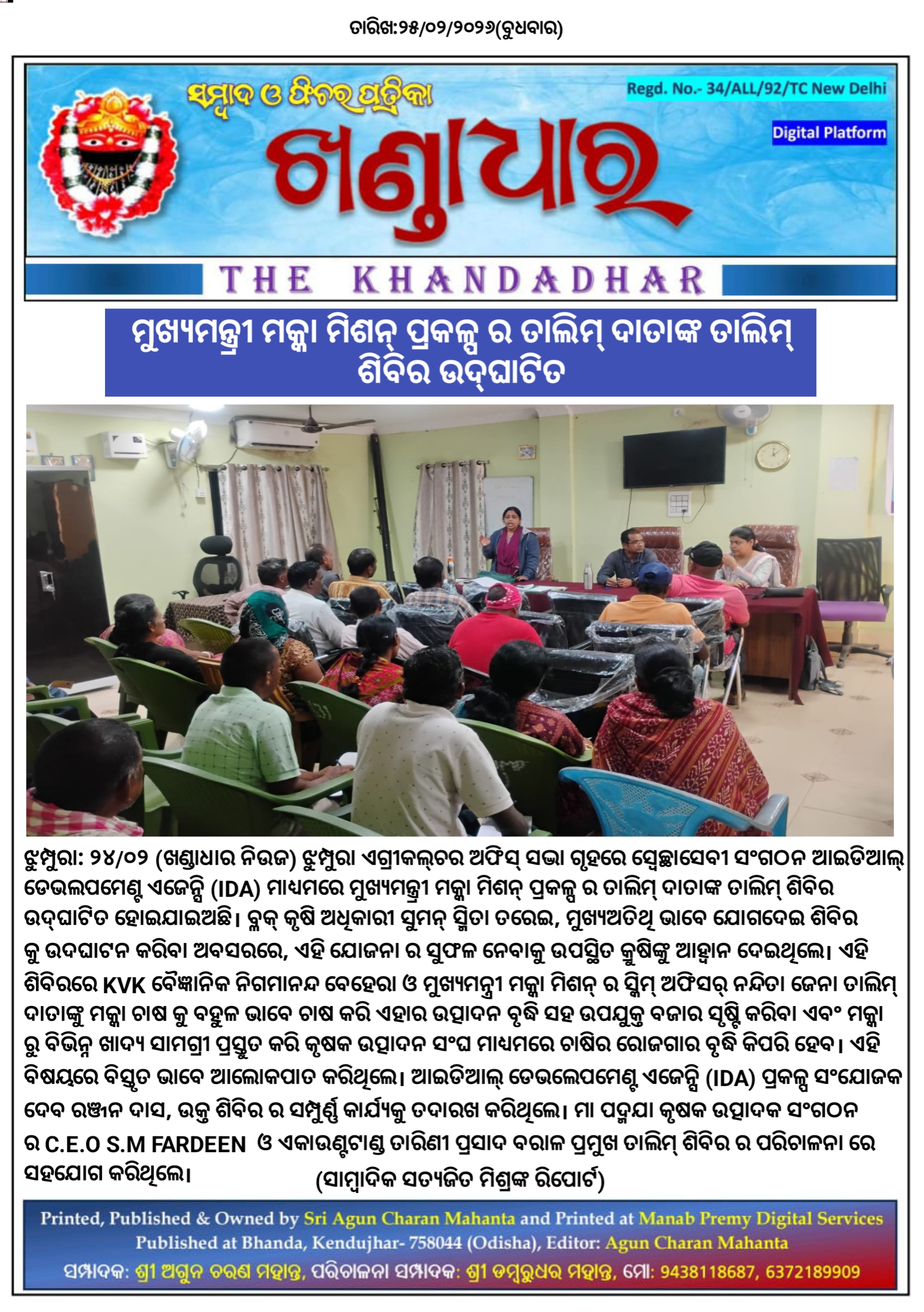 ଝୁମ୍ପୁରା: ୨୪/୦୨ (ଖଣ୍ଡାଧାର ନିଉଜ) ଝୁମ୍ପୁରା ଏଗ୍ରୀକଲ୍‌ଚର ଅଫିସ୍ ସଦ୍ଭା ଗୃହରେ ସ୍ଵେଚ୍ଛାସେବୀ ସଂଗଠନ ଆଇଡିଆଲ୍ ଡେଭଲପମେଣ୍ଟ ଏଜେନ୍ସି (IDA) ମାଧ୍ୟମରେ ମୁଖ୍ୟମନ୍ତ୍ର୍ରୀ ମକ୍କା ମିଶନ୍ ପ୍ରକଳ୍ପ ର ତାଲିମ୍ ଦାତାଙ୍କ ତାଲିମ୍ ଶିବିର ଉଦ୍‌ଘାଟିତ ହୋଇଯାଇଅଛି। ବ୍ଳକ୍ କୃଷି ଅଧିକାରୀ ସୁମନ୍ ସ୍ମିତା ତରେଇ, ମୁଖ୍ୟଅତିଥି ଭାବେ ଯୋଗଦେଇ ଶିବିର କୁ ଉଦଘାଟନ କରିବା ଅବସରରେ, ଏହି ଯୋଜନା ର ସୁଫଳ ନେବାକୁ ଉପସ୍ଥିତ କ୍ରୁଷିଙ୍କୁ ଆହ୍ବାନ ଦେଇଥିଲେ। ଏହି ଶିବିରରେ KVK ବୈଜ୍ଞାନିକ ନିଗମାନନ୍ଦ ବେହେରା ଓ ମୁଖ୍ୟମନ୍ତ୍ରୀ ମକ୍କା ମିଶନ୍ ର ସ୍କିମ୍ ଅଫିସର୍ ନନ୍ଦିତା ଜେନା ତାଲିମ୍ ଦାତାଙ୍କୁ ମକ୍କା ଚାଷ କୁ ବହୁଳ ଭାବେ ଚାଷ କରି ଏହାର ଉତ୍ପାଦନ ବୃଦ୍ଧି ସହ ଉପଯୁକ୍ତ ବଜାର ସୃଷ୍ଟି କରିବା ଏବଂ ମକ୍କା ରୁ ବିଭିନ୍ନ ଖାଦ୍ୟ ସାମଗ୍ରୀ ପ୍ରସ୍ତୁତ କରି କୃଷକ ଉତ୍ପାଦନ ସଂଘ ମାଧ୍ୟମରେ ଚାଷିର ରୋଜଗାର ବୃଦ୍ଧି କିପରି ହେବ। ଏହି ବିଷୟରେ ବିସ୍ତୃତ ଭାବେ ଆଲୋକପାତ କରିଥିଲେ। ଆଇଡିଆଲ୍ ଡେଭଲେପମେଣ୍ଟ ଏଜେନ୍ସି (IDA) ପ୍ରକଳ୍ପ ସଂଯୋଜକ ଦେବ ରଞ୍ଜନ ଦାସ, ଉକ୍ତ ଶିବିର ର ସମ୍ପୁର୍ଣ୍ଣ କାର୍ଯ୍ୟକୁ ତଦାରଖ କରିଥିଲେ। ମା ପଦ୍ମଯା କୃଷକ ଉତ୍ପାଦକ ସଂଗଠନ ର C.E.O S.M FARDEEN ଓ ଏକାଉଣ୍ଟଟାଣ୍ଡ ତାରିଣୀ ପ୍ରସାଦ ବରାଳ ପ୍ରମୁଖ ତାଲିମ୍ ଶିବିର ର ପରିଚାଳନା ରେ ସହଯୋଗ କରିଥିଲେ।