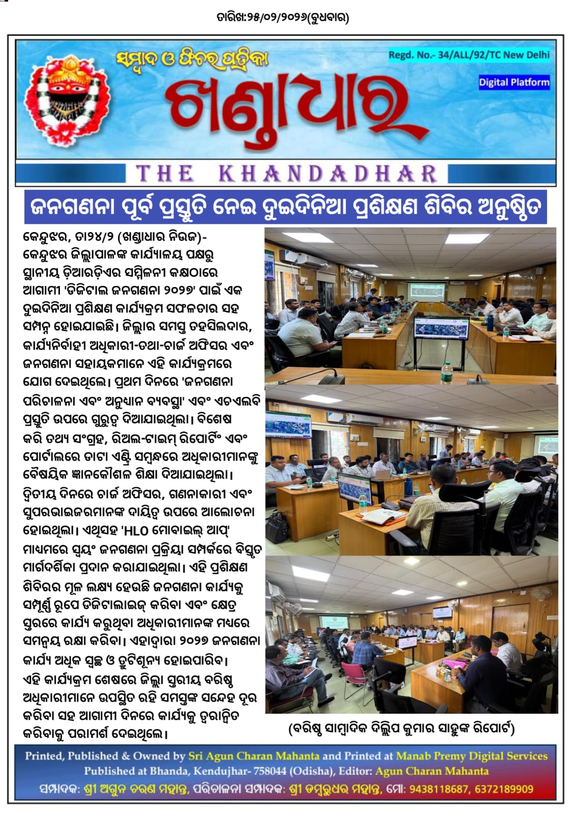 କେନ୍ଦୁଝର,ତା୨୪/୨- କେନ୍ଦୁଝର ଜିଲ୍ଲାପାଳଙ୍କ କାର୍ଯ୍ୟାଳୟ ପକ୍ଷରୁ ସ୍ଥାନୀୟ ଡ଼ିଆରଡ଼ିଏର ସମ୍ମିଳନୀ କକ୍ଷଠାରେ ଆଗାମୀ 'ଡିଜିଟାଲ ଜନଗଣନା ୨୦୨୭' ପାଇଁ ଏକ ଦୁଇଦିନିଆ ପ୍ରଶିକ୍ଷଣ କାର୍ଯ୍ୟକ୍ରମ ସଫଳତାର ସହ ସମ୍ପନ୍ନ ହୋଇଯାଇଛି। ଜିଲ୍ଲାର ସମସ୍ତ ତହସିଲଦାର, କାର୍ଯ୍ୟନିର୍ବାହୀ ଅଧିକାରୀ-ତଥା-ଚାର୍ଜ ଅଫିସର ଏବଂ ଜନଗଣନା ସହାୟକମାନେ ଏହି କାର୍ଯ୍ୟକ୍ରମରେ ଯୋଗ ଦେଇଥିଲେ। ପ୍ରଥମ ଦିନରେ 'ଜନଗଣନା ପରିଚାଳନା ଏବଂ ଅନୁଧ୍ୟାନ ବ୍ୟବସ୍ଥା' ଏବଂ ଏଚଏଲବି ପ୍ରସ୍ତୁତି ଉପରେ ଗୁରୁତ୍ୱ ଦିଆଯାଇଥିଲା। ବିଶେଷ କରି ତଥ୍ୟ ସଂଗ୍ରହ, ରିଅଲ-ଟାଇମ୍ ରିପୋର୍ଟିଂ ଏବଂ ପୋର୍ଟାଲରେ ଡାଟା ଏଣ୍ଟ୍ରି ସମ୍ବନ୍ଧରେ ଅଧିକାରୀମାନଙ୍କୁ ବୈଷୟିକ ଜ୍ଞାନକୌଶଳ ଶିକ୍ଷା ଦିଆଯାଇଥିଲା। ଦ୍ୱିତୀୟ ଦିନରେ ଚାର୍ଜ ଅଫିସର, ଗଣନାକାରୀ ଏବଂ ସୁପରଭାଇଜରମାନଙ୍କ ଦାୟିତ୍ୱ ଉପରେ ଆଲୋଚନା ହୋଇଥିଲା। ଏଥିସହ 'HLO ମୋବାଇଲ୍ ଆପ୍' ମାଧ୍ୟମରେ ସ୍ୱୟଂ ଜନଗଣନା ପ୍ରକ୍ରିୟା ସମ୍ପର୍କରେ ବିସ୍ତୃତ ମାର୍ଗଦର୍ଶିକା ପ୍ରଦାନ କରାଯାଇଥିଲା। ଏହି ପ୍ରଶିକ୍ଷଣ ଶିବିରର ମୂଳ ଲକ୍ଷ୍ୟ ହେଉଛି ଜନଗଣନା କାର୍ଯ୍ୟକୁ ସମ୍ପୂର୍ଣ୍ଣ ରୂପେ ଡିଜିଟାଲାଇଜ୍ କରିବା ଏବଂ କ୍ଷେତ୍ର ସ୍ତରରେ କାର୍ଯ୍ୟ କରୁଥିବା ଅଧିକାରୀମାନଙ୍କ ମଧ୍ୟରେ ସମନ୍ୱୟ ରକ୍ଷା କରିବା। ଏହାଦ୍ୱାରା ୨୦୨୭ ଜନଗଣନା କାର୍ଯ୍ୟ ଅଧିକ ସ୍ୱଚ୍ଛ ଓ ତ୍ରୁଟିଶୂନ୍ୟ ହୋଇପାରିବ।ଏହି କାର୍ଯ୍ୟକ୍ରମ ଶେଷରେ ଜିଲ୍ଲା ସ୍ତରୀୟ ବରିଷ୍ଠ ଅଧିକାରୀମାନେ ଉପସ୍ଥିତ ରହି ସମସ୍ତଙ୍କ ସନ୍ଦେହ ଦୂର କରିବା ସହ ଆଗାମୀ ଦିନରେ କାର୍ଯ୍ୟକୁ ତ୍ୱରାନ୍ୱିତ କରିବାକୁ ପରାମର୍ଶ ଦେଇଥିଲେ।