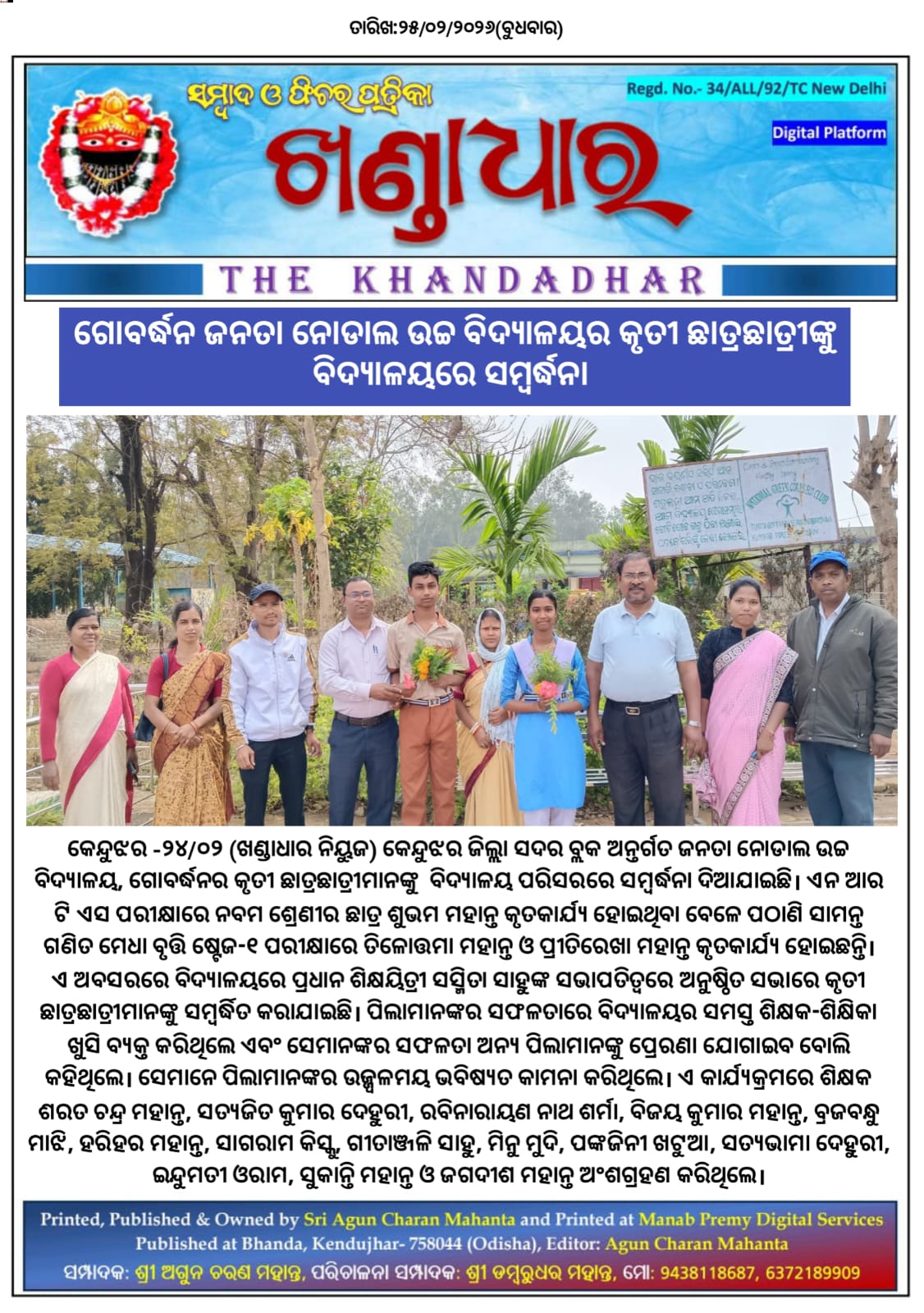 ଗୋବର୍ଦ୍ଧନ ଜନତା ନୋଡାଲ ଉଚ୍ଚ ବିଦ୍ୟାଳୟର କୃତୀ ଛାତ୍ରଛାତ୍ରୀଙ୍କୁ ବିଦ୍ୟାଳୟରେ ସମ୍ବର୍ଦ୍ଧନା।