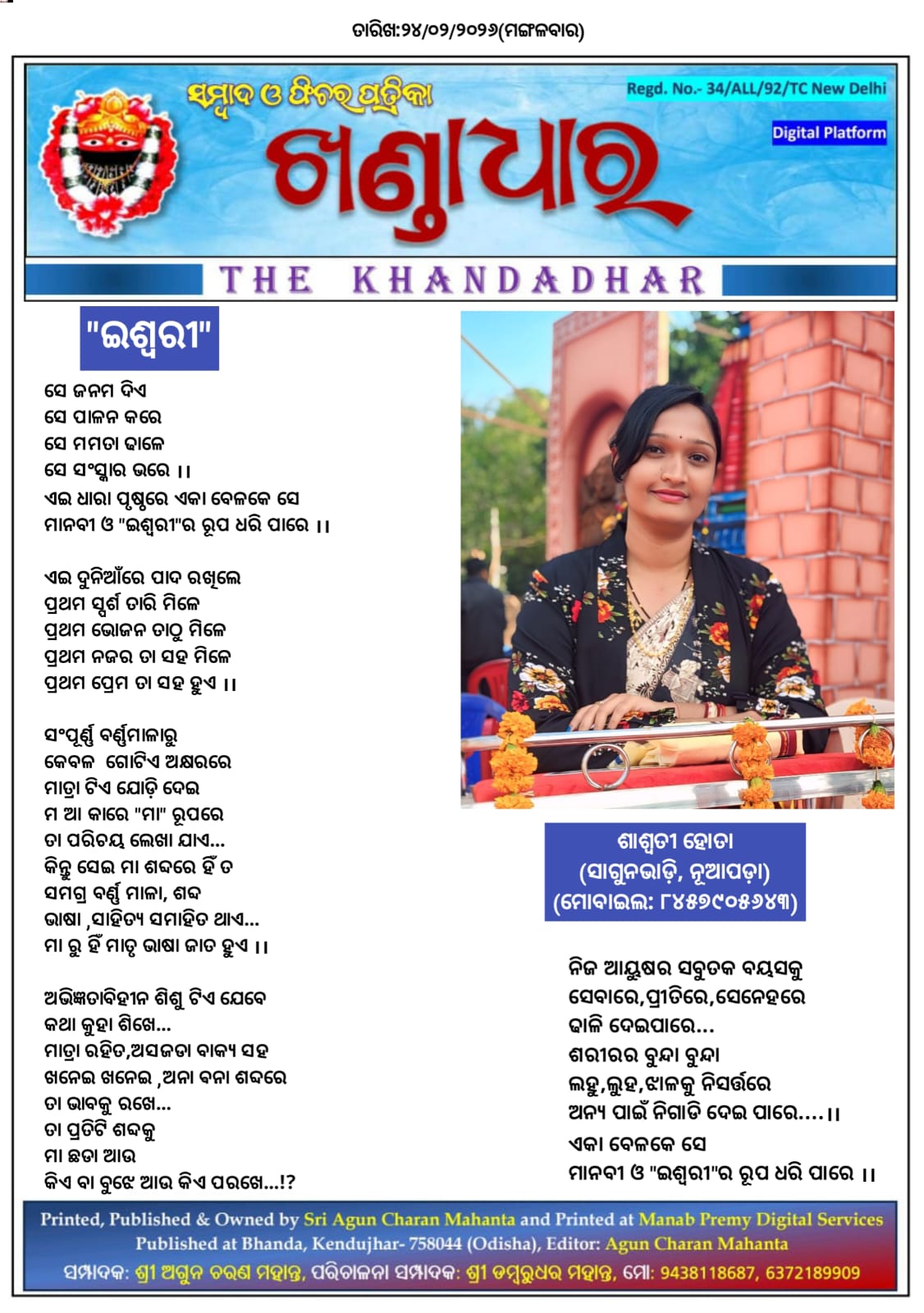 "ଇଶ୍ୱରୀ"- ଶାଶ୍ବତ ହୋତା ଙ୍କ ଦ୍ଵାରା ରଚିତ କବିତା।