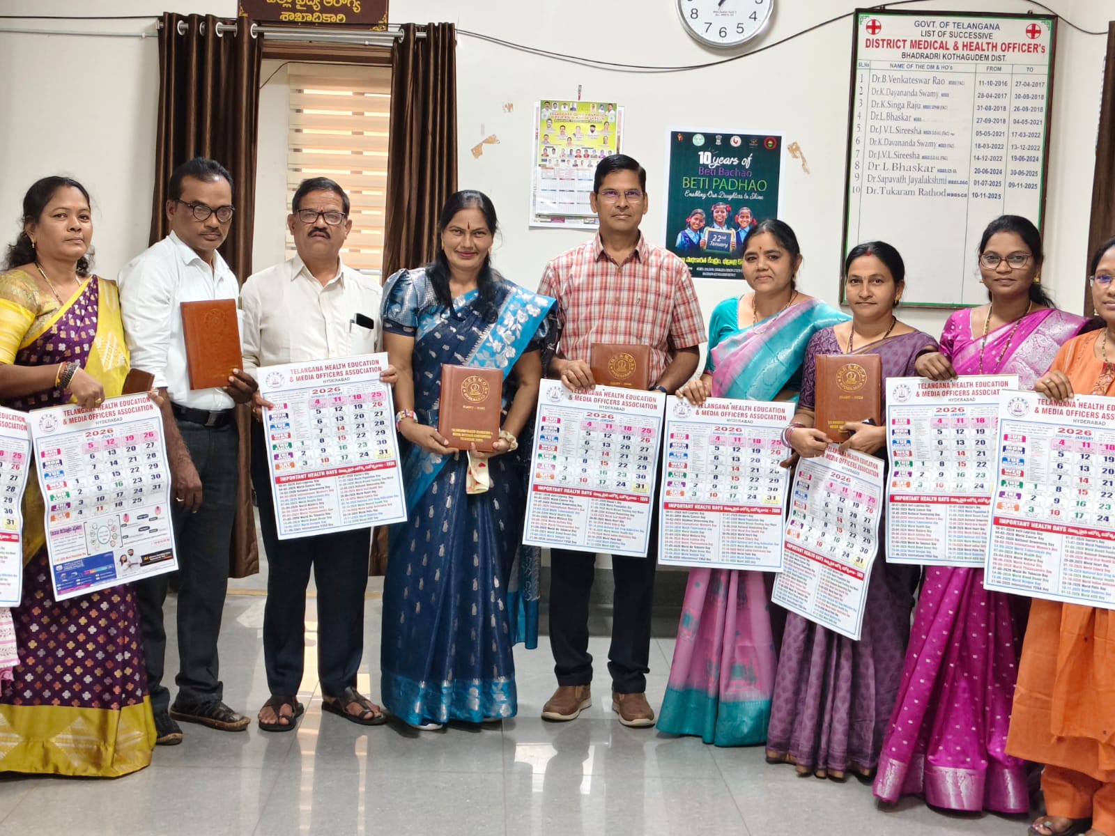 భద్రాద్రి కొత్తగూడెం జిల్లా వైద్య మరియు ఆరోగ్య శాఖ అధికారి కార్యాలయం నందు బుధవారం నాడు జిల్లా వైద్య మరియు ఆరోగ్య శాఖ అధికారి డాక్టర్ తుకారాం రాథోడ్ తెలంగాణ హెల్త్ ఎడ్యుకేషన్ అండ్ మాస్ మీడియా ఆఫీసర్స్ అసోసియేషన్ డైరీని ఆవిష్కరించారు.ఈ సందర్భంగా హెల్త్ ఎడ్యుకేటర్ల సమావేశం నిర్వహించబడింది. జిల్లాలోని ప్రతి పాఠశాలలు, హాస్టళ్లు మరియు కళాశాలలను సందర్శించి విద్యార్థులకు ఆరోగ్య విద్యపై అవగాహన కల్పించాలని, వ్యక్తిగత పరిశుభ్రత, పోషకాహారం, అంటువ్యాధుల నివారణ వంటి అంశాలపై బోధనలు నిర్వహించాలని ఆయన సూచించారు.ఆరోగ్యవంతమైన సమాజ నిర్మాణంలో హెల్త్ ఎడ్యుకేటర్ల పాత్ర అత్యంత కీలకమని ఈ సందర్భంగా తెలిపారు. ఈ కార్యక్రమంలో డిప్యూటీ డెమో నాగలక్ష్మి, చింగోజి ఆఫీస్ సూపరింటెండెంట్, సోమ్లా సిహెచ్ఓ, హెల్త్ ఎడ్యుకేటర్లు బేబీ ,జయలక్ష్మి, అమ్మని ,లక్ష్మీబాయి, కృష్ణవేణి, రమాదేవి , లీలా మరియు వైద్య సిబ్బంది పాల్గొన్నారు