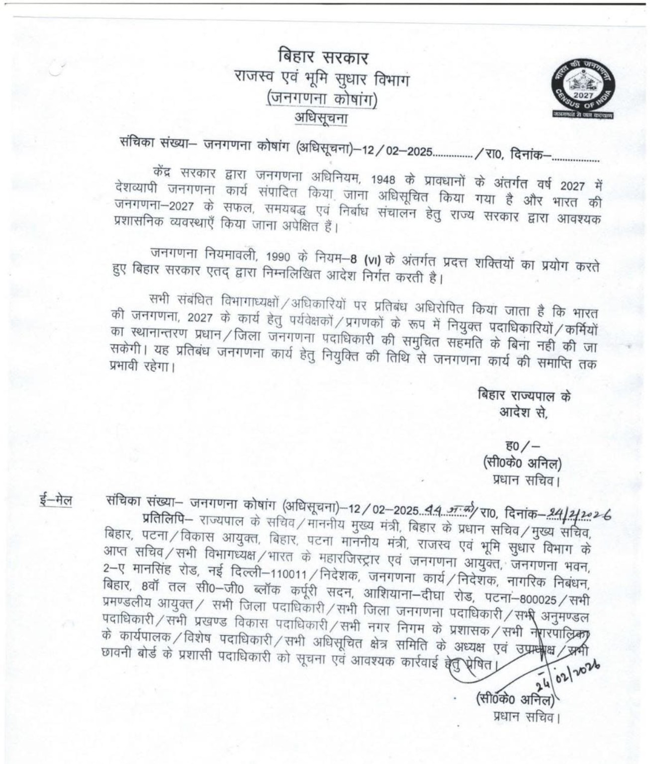 рдмрд┐рд╣рд╛рд░ рд╕рд░рдХрд╛рд░ рдХреЗ рд░рд╛рдЬрд╕реНрд╡ рдПрд╡рдВ рднреВрдорд┐ рд╕реБрдзрд╛рд░ рд╡рд┐рднрд╛рдЧ (рдЬрдирдЧрдгрдирд╛ рдХреЛрд╖рд╛рдВрдЧ) рдиреЗ рдЬрдирдЧрдгрдирд╛ 2027 рдХреЛ рд▓реЗрдХрд░ рдорд╣рддреНрд╡рдкреВрд░реНрдг рдЕрдзрд┐рд╕реВрдЪрдирд╛ рдЬрд╛рд░реА рдХреА рд╣реИред рдЬрд╛рд░реА рдЖрджреЗрд╢ рдХреЗ рдЕрдиреБрд╕рд╛рд░, рдЬрдирдЧрдгрдирд╛ 2027 рдХреЗ рд▓рд┐рдП рдкрд░реНрдпрд╡реЗрдХреНрд╖рдХ (Supervisor) рдПрд╡рдВ рдкреНрд░рдЧрдгрдХ (Enumerator) рдХреЗ рд░реВрдк рдореЗрдВ рдирд┐рдпреБрдХреНрдд рдкрджрд╛рдзрд┐рдХрд╛рд░реА/рдХрд░реНрдорд┐рдпреЛрдВ рдХрд╛ рд╕реНрдерд╛рдирд╛рдВрддрд░рдг рдЕрдм рдмрд┐рдирд╛ рд╕рдореБрдЪрд┐рдд рдЕрдиреБрдорддрд┐ рдХреЗ рдирд╣реАрдВ рдХрд┐рдпрд╛ рдЬрд╛ рд╕рдХреЗрдЧрд╛ред