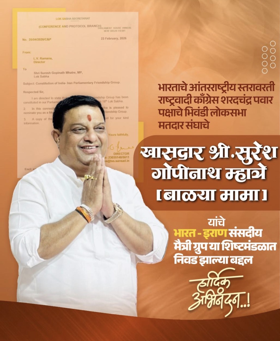 भिवंडीचे खासदार सुरेश म्हात्रे यांची 'भारत-इराण संसदीय मैत्री गटा'त निवड; आंतरराष्ट्रीय स्तरावर महाराष्ट्राचा दबदबा