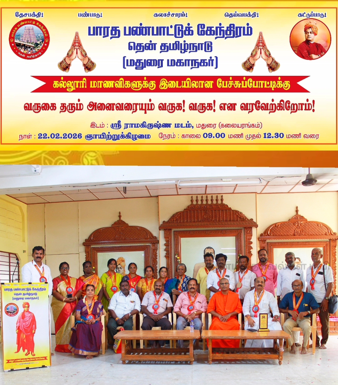 भारतीय पनपट्टू केंद्र, विवेकानंद कॉलेज, मदुरै, तमिलनाडु की ओर से एडमिनिस्ट्रेटर्स ने भारत की सांस्कृतिक विरासत से जुड़े कई प्रोग्राम ऑर्गनाइज़ किए। बड़ी संख्या में स्टूडेंट्स ने हिस्सा लिया। आम लोगों ने भी प्रोग्राम में हिस्सा लिया।