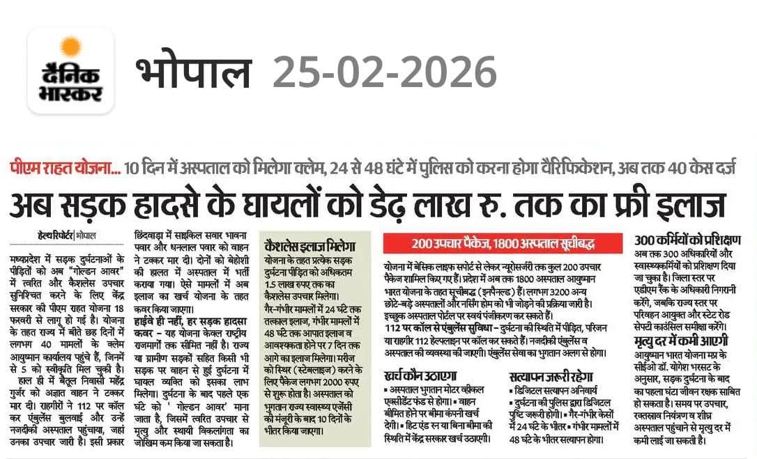 अब सड़क हादसे के घायलों को डेढ़ लाख रुपए तक का फ्री इलाज
