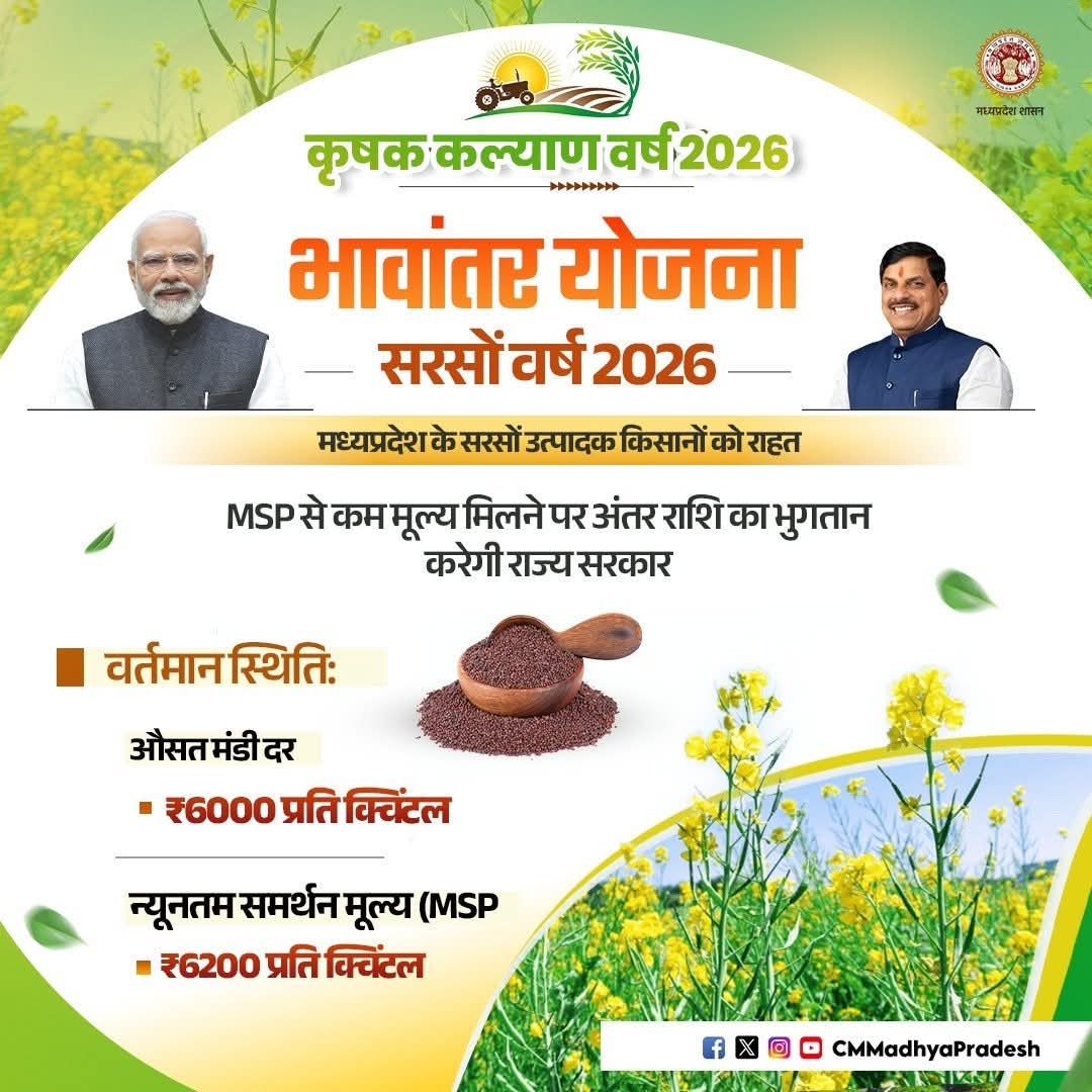 कृषक कल्याण वर्ष 2026 के अंतर्गत मध्यप्रदेश शासन द्वारा सरसों उत्पादक किसानों को आर्थिक राहत प्रदान करने हेतु भावांतर योजना संचालित की जा रही है। योजना के तहत यदि किसानों को अपनी उपज का बाजार मूल्य न्यूनतम समर्थन मूल्य (एमएसपी) से कम प्राप्त होता है, तो राज्य सरकार द्वारा अंतर राशि का भुगतान किया जाएगा।