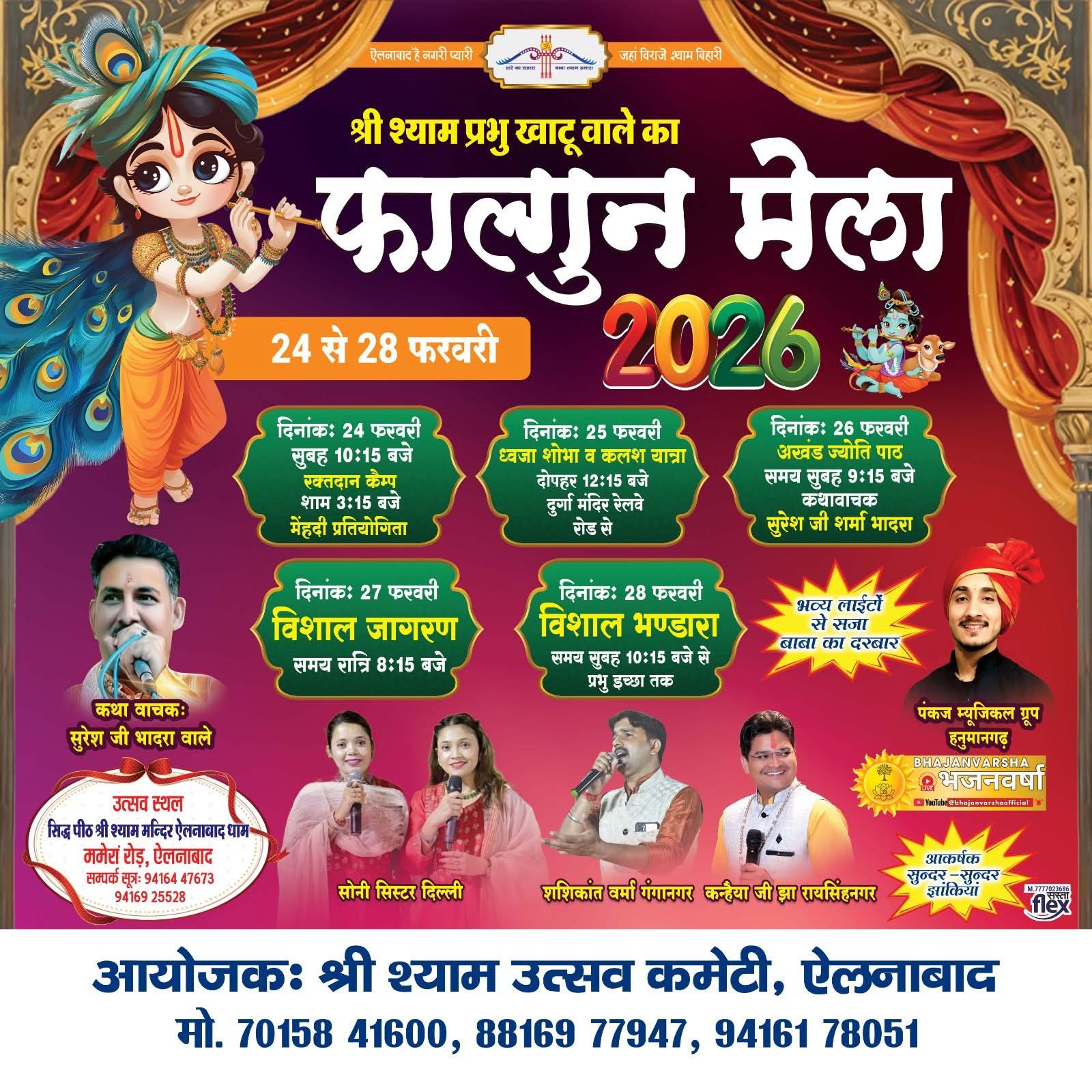 फाल्गुन मेला श्री श्याम मंदिर ममेरा रोड ऐलनाबाद में शुरू हो गया है भगतों में श्रद्धा और श्री श्याम बाबा के प्रति प्रेम भावना है और दूर दूर से भगत बाबा के मंदिर में आ रहे हैं