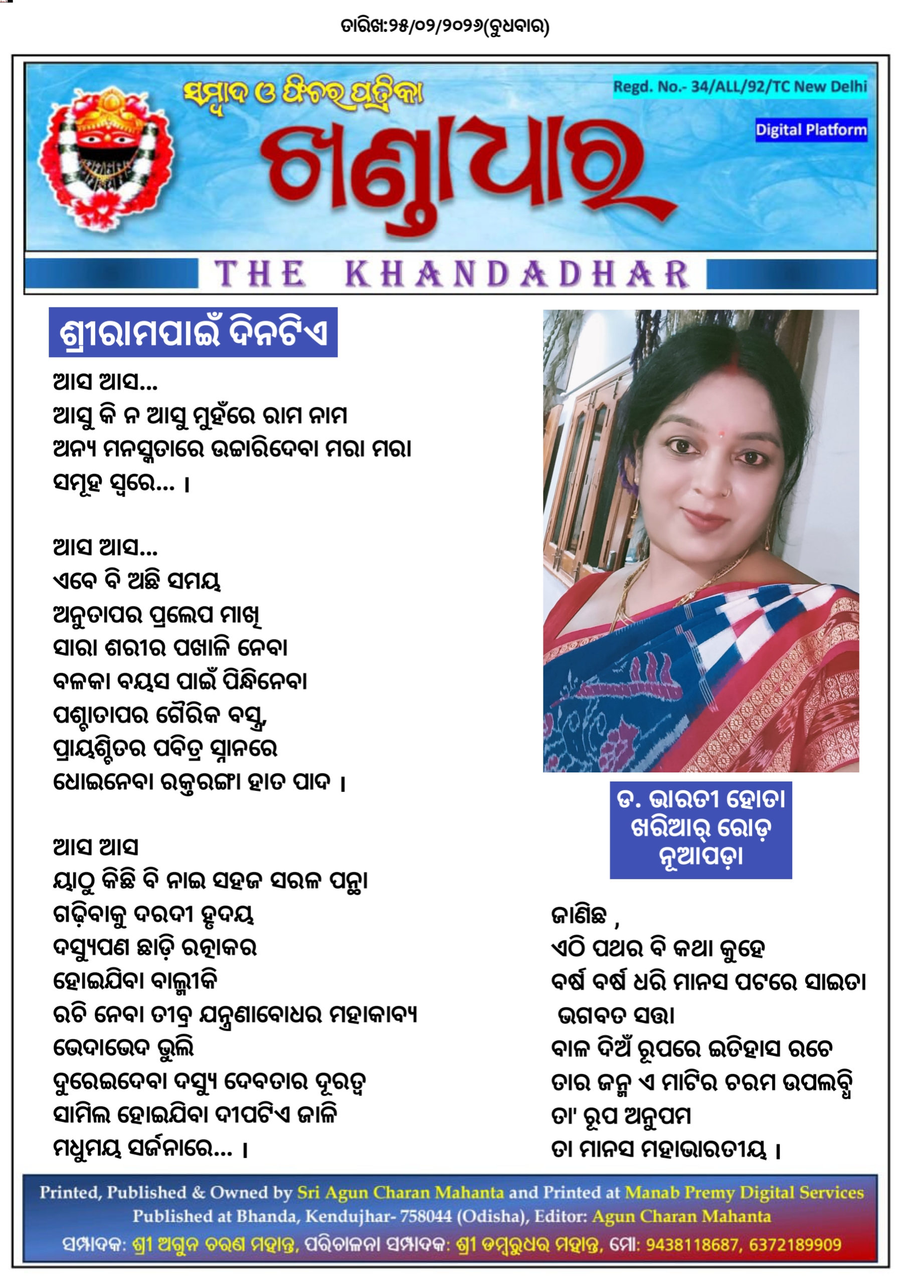 ଶ୍ରୀରାମପାଇଁ ଦିନଟିଏ - ଡ. ଭାରତୀ ହୋତା ଙ୍କ ଦ୍ଵାରା ରଚିତ କବିତା।