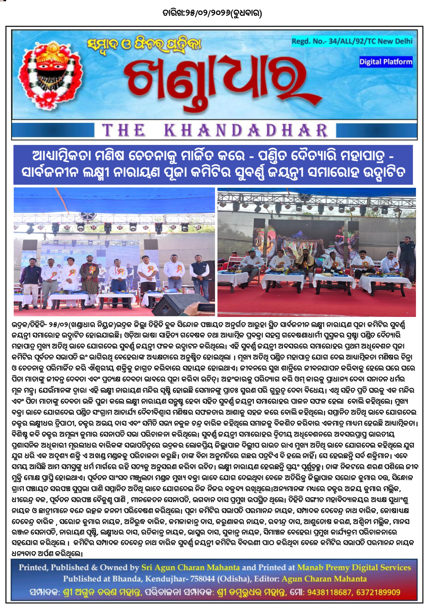 - ସାର୍ବଜନୀନ ଲକ୍ଷ୍ମୀ ନାରାୟଣ ପୂଜା କମିଟିର ସୁବର୍ଣ୍ଣ ଜୟନ୍ତୀ ସମାରୋହ ଉଦ୍ଘାଟିତ