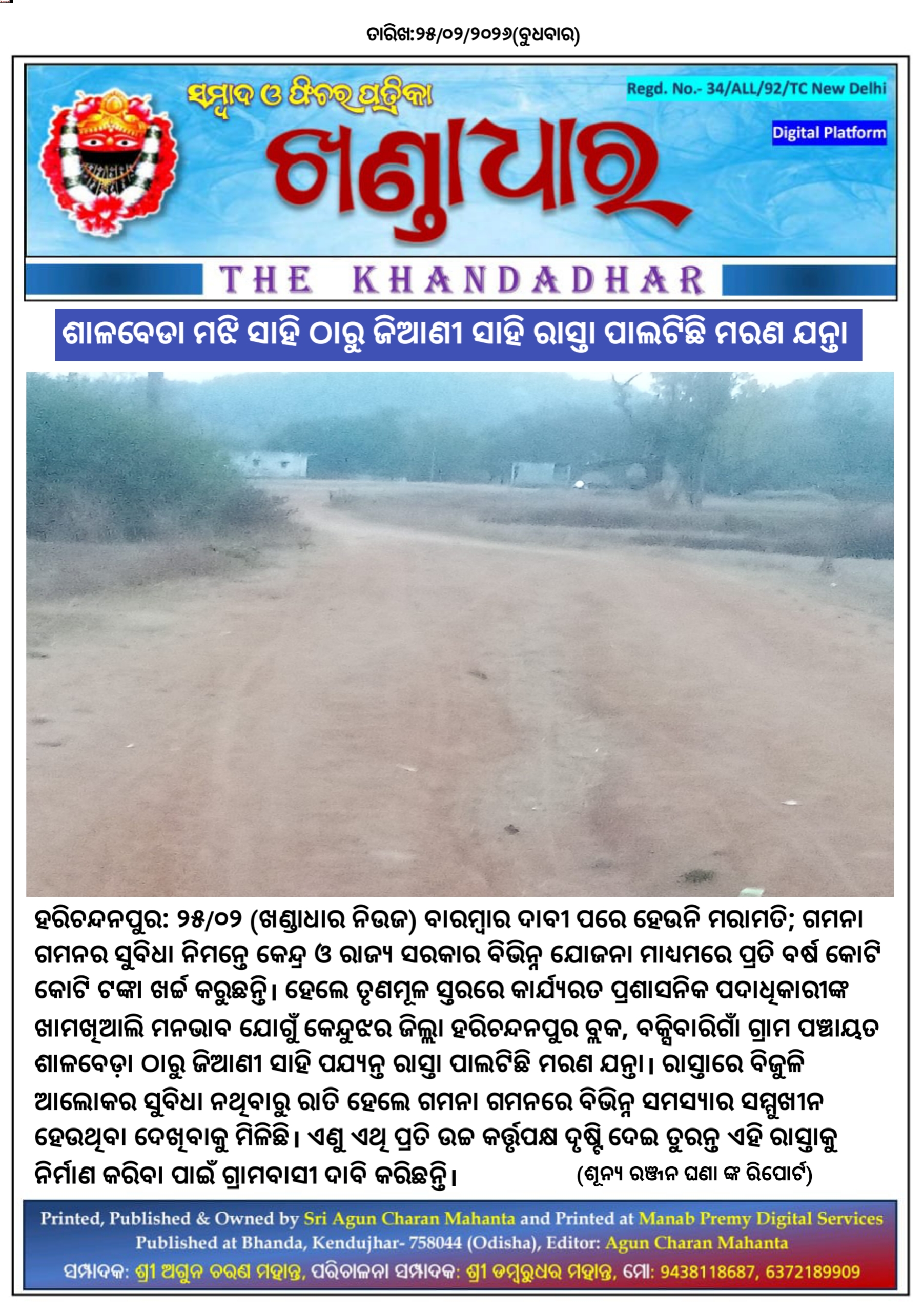 ହରିଚନ୍ଦନପୁର: ୨୫/୦୨ (ଖଣ୍ଡାଧାର ନିଉଜ) ବାରମ୍ବାର ଦାବୀ ପରେ ହେଉନି ମରାମତି; ଗମନା ଗମନର ସୁବିଧା ନିମନ୍ତେ କେନ୍ଦ୍ର ଓ ରାଜ୍ୟ ସରକାର ବିଭିନ୍ନ ଯୋଜନା ମାଧ୍ୟମରେ ପ୍ରତି ବର୍ଷ କୋଟି କୋଟି ଟଙ୍କା ଖର୍ଚ୍ଚ କରୁଛନ୍ତି। ହେଲେ ତୃଣମୂଳ ସ୍ତରରେ କାର୍ଯ୍ୟରତ ପ୍ରଶାସନିକ ପଦାଧିକାରୀଙ୍କ ଖାମଖିଆଲି ମନଭାବ ଯୋଗୁଁ କେନ୍ଦୁଝର ଜିଲ୍ଲା ହରିଚନ୍ଦନପୁର ବ୍ଲକ, ବକ୍ସିବାରିଗାଁ ଗ୍ରାମ ପଞ୍ଚାୟତ ଶାଳବେଡ଼ା ଠାରୁ ଜିଆଣୀ ସାହି ପଯ୍ୟନ୍ତ ରାସ୍ତା ପାଲଟିଛି ମରଣ ଯନ୍ତା। ରାସ୍ତାରେ ବିଜୁଳି ଆଲୋକର ସୁବିଧା ନଥିବାରୁ ରାତି ହେଲେ ଗମନା ଗମନରେ ବିଭିନ୍ନ ସମସ୍ୟାର ସମ୍ମୁଖୀନ ହେଉଥିବା ଦେଖିବାକୁ ମିଳିଛି। ଏଣୁ ଏଥି ପ୍ରତି ଉଚ୍ଚ କର୍ତ୍ତୃପକ୍ଷ ଦୃଷ୍ଟି ଦେଇ ତୁରନ୍ତ ଏହି ରାସ୍ତାକୁ ନିର୍ମାଣ କରିବା ପାଇଁ ଗ୍ରାମବାସୀ ଦାବି କରିଛନ୍ତି।