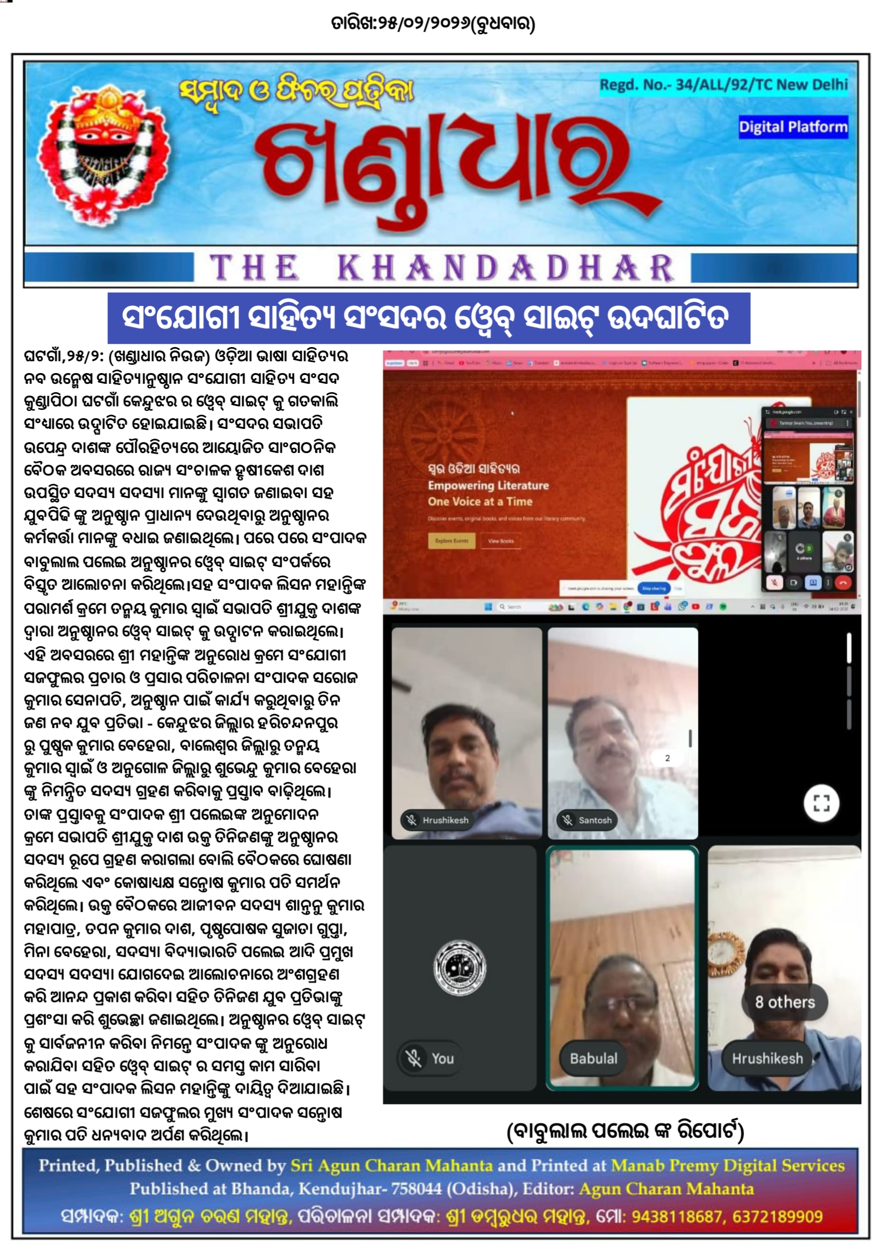ଘଟଗାଁ,୨୫/୨: ( ଖଣ୍ଡାଧାର ନିଉଜ )ଓଡ଼ିଆ ଭାଷା ସାହିତ୍ୟର ନବ ଉନ୍ମେଷ ସାହିତ୍ଯାନୁଷ୍ଠାନ ସଂଯୋଗୀ ସାହିତ୍ୟ ସଂସଦ କୁଣ୍ଡାପିଠା ଘଟଗାଁ କେନ୍ଦୁଝର ର ଓ୍ବେବ୍ ସାଇଟ୍ କୁ ଗତକାଲି ସଂଧ୍ୟାରେ ଉଦ୍ଘାଟିତ ହୋଇଯାଇଛି।