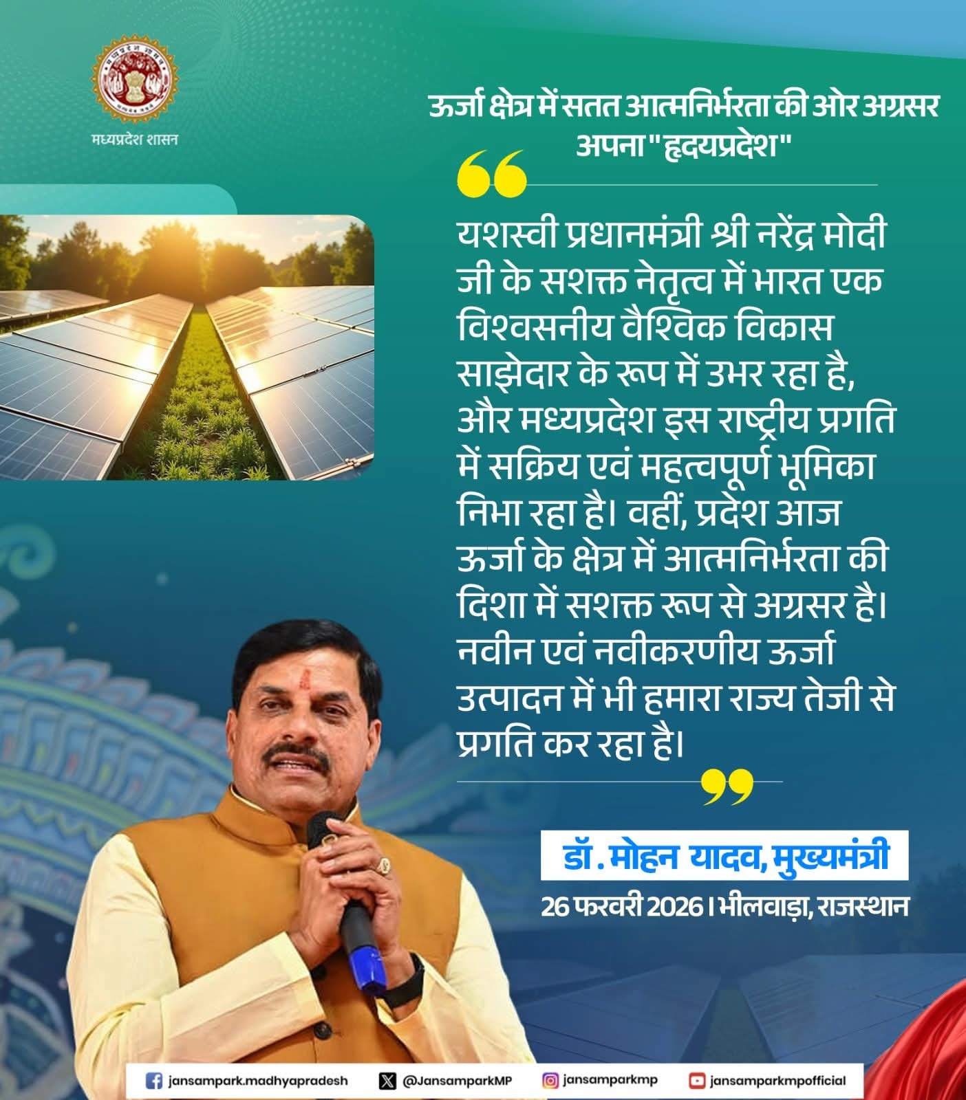 यशस्वी प्रधानमंत्री श्री Narendra Modi जी के सशक्त नेतृत्व में भारत एक विश्वसनीय वैश्विक विकास साझेदार के रूप में उभर रहा है, और मध्यप्रदेश इस राष्ट्रीय प्रगति में सक्रिय एवं महत्वपूर्ण भूमिका निभा रहा है। वहीं, प्रदेश आज ऊर्जा के क्षेत्र में आत्मनिर्भरता की दिशा में सशक्त रूप से अग्रसर है। नवीन एवं नवीकरणीय ऊर्जा उत्पादन में भी हमारा राज्य तेजी से प्रगति कर रहा है।