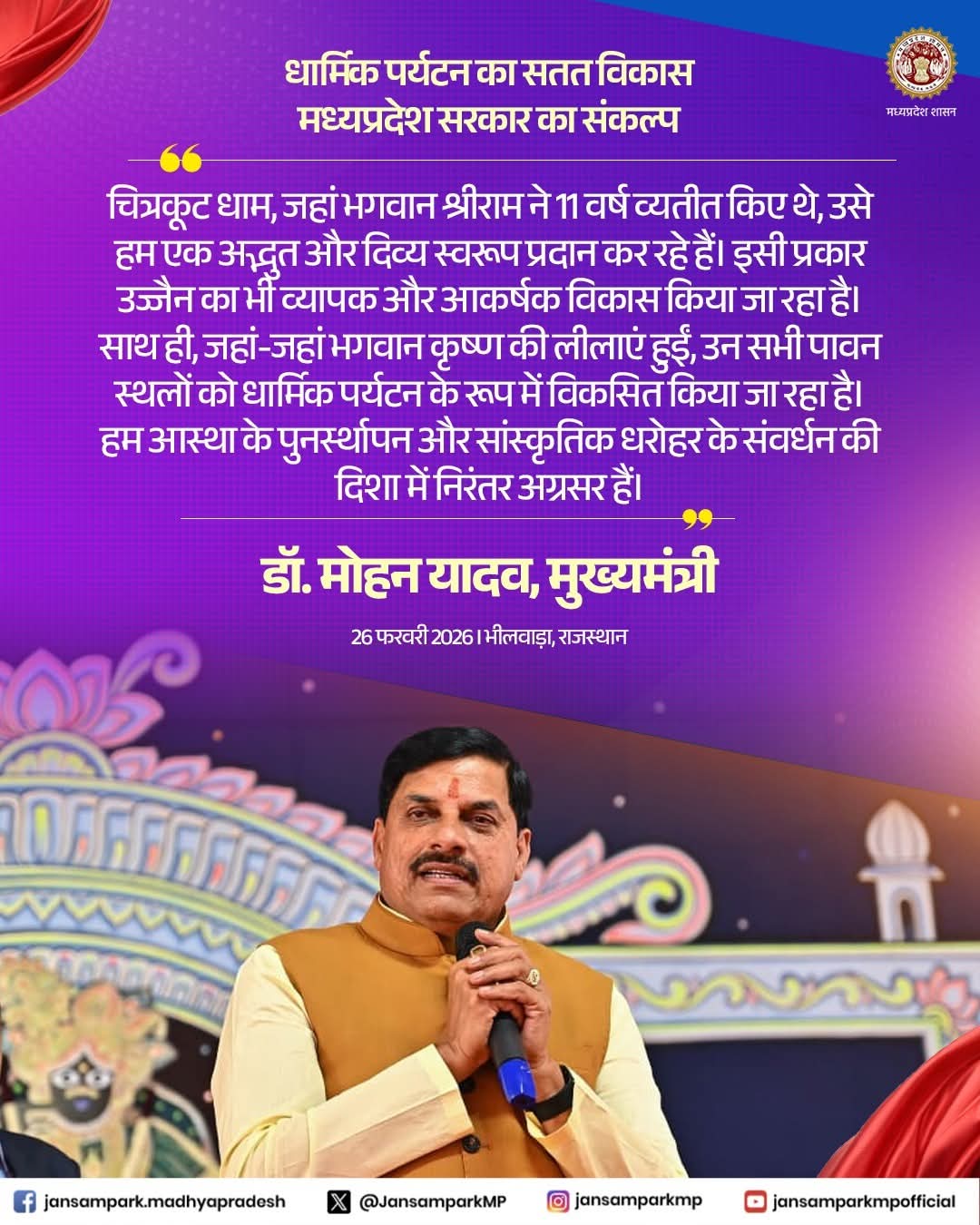 चित्रकूट धाम, जहां भगवान श्रीराम ने 11 वर्ष व्यतीत किए थे, उसे हम एक अद्भुत और दिव्य स्वरूप प्रदान कर रहे हैं। इसी प्रकार उज्जैन का भी व्यापक और आकर्षक विकास किया जा रहा है। साथ ही, जहां-जहां भगवान कृष्ण की लीलाएं हुईं, उन सभी पावन स्थलों को धार्मिक पर्यटन के रूप में विकसित किया जा रहा है। हम आस्था के पुनर्स्थापन और सांस्कृतिक धरोहर के संवर्धन की दिशा में निरंतर अग्रसर हैं।