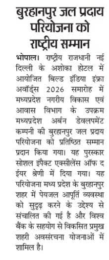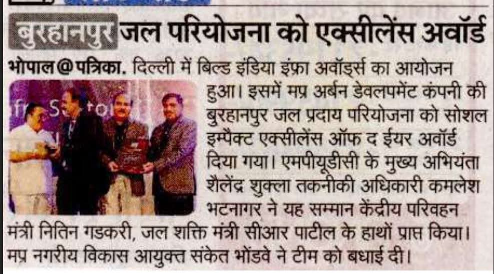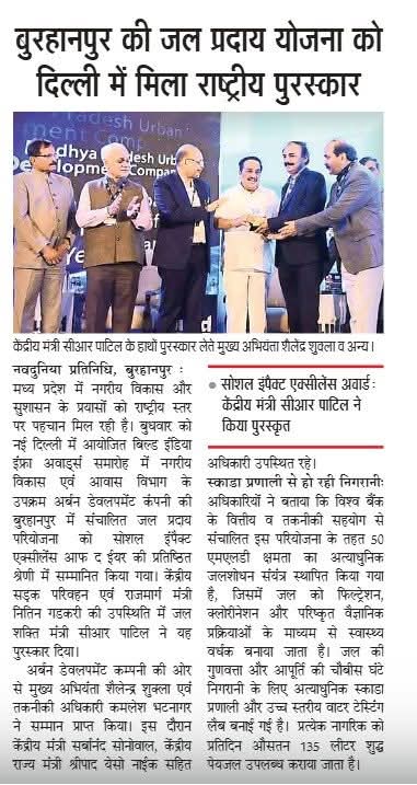 बुरहानपुर की जलप्रदाय योजना को दिल्ली में मिला राष्ट्रीय पुरस्कार