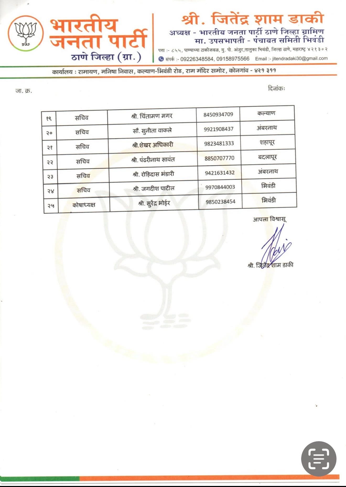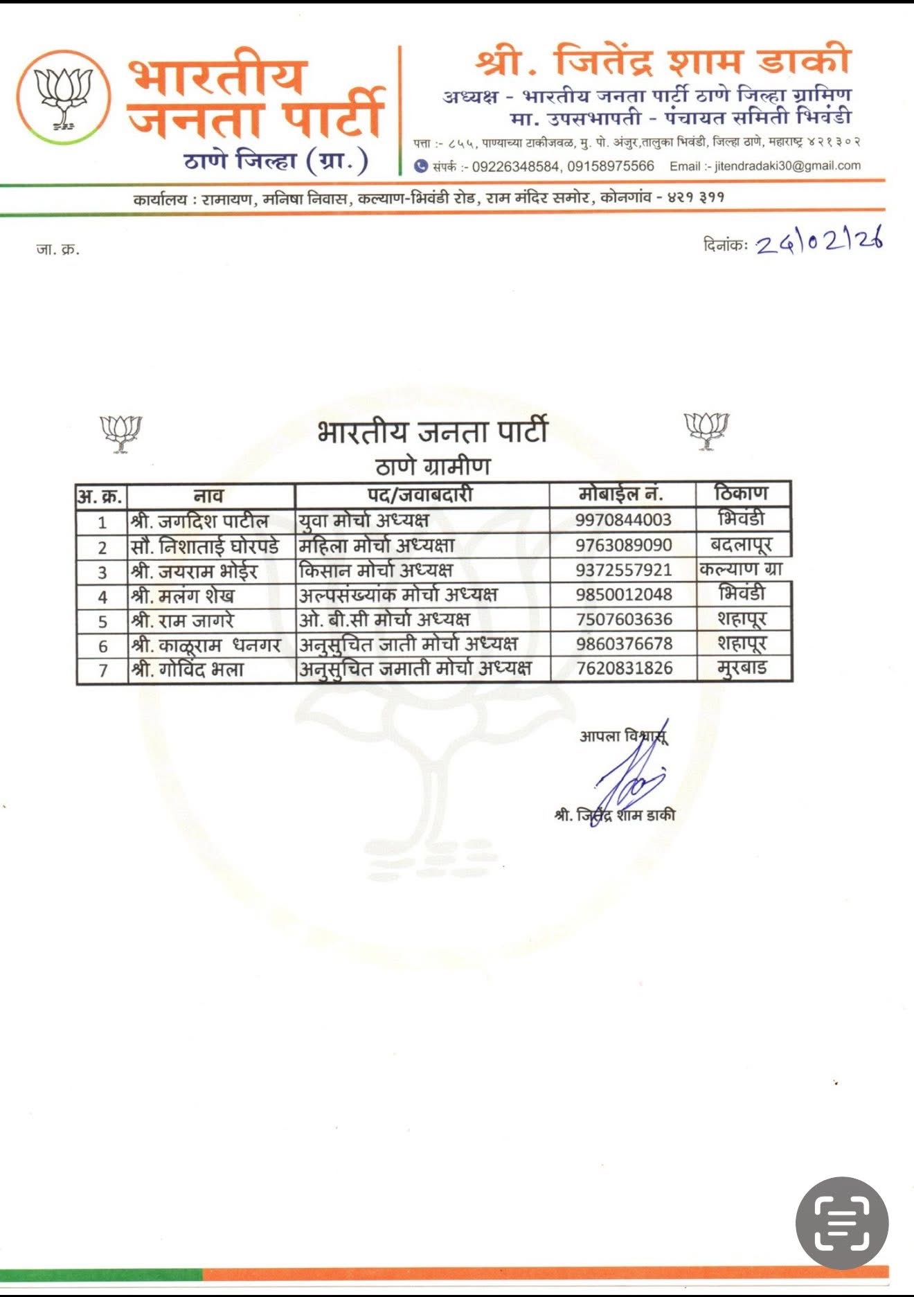 ही कार्यकारिणी जाहीर करताना माजी केंद्रीय राज्यमंत्री श्री. कपिल पाटील साहेब, आमदार श्री. किसन कथोरे साहेब आणि आमदार श्री. ज्ञानेश्वर म्हात्रे साहेब यांचे विशेष मार्गदर्शन लाभले आहे. जिल्ह्याच्या सर्वांगीण विकासासाठी आणि पक्ष संघटना तळागाळापर्यंत पोहोचवण्यासाठी या नेत्यांच्या मार्गदर्शनाखाली ही टीम काम करणार आहे.