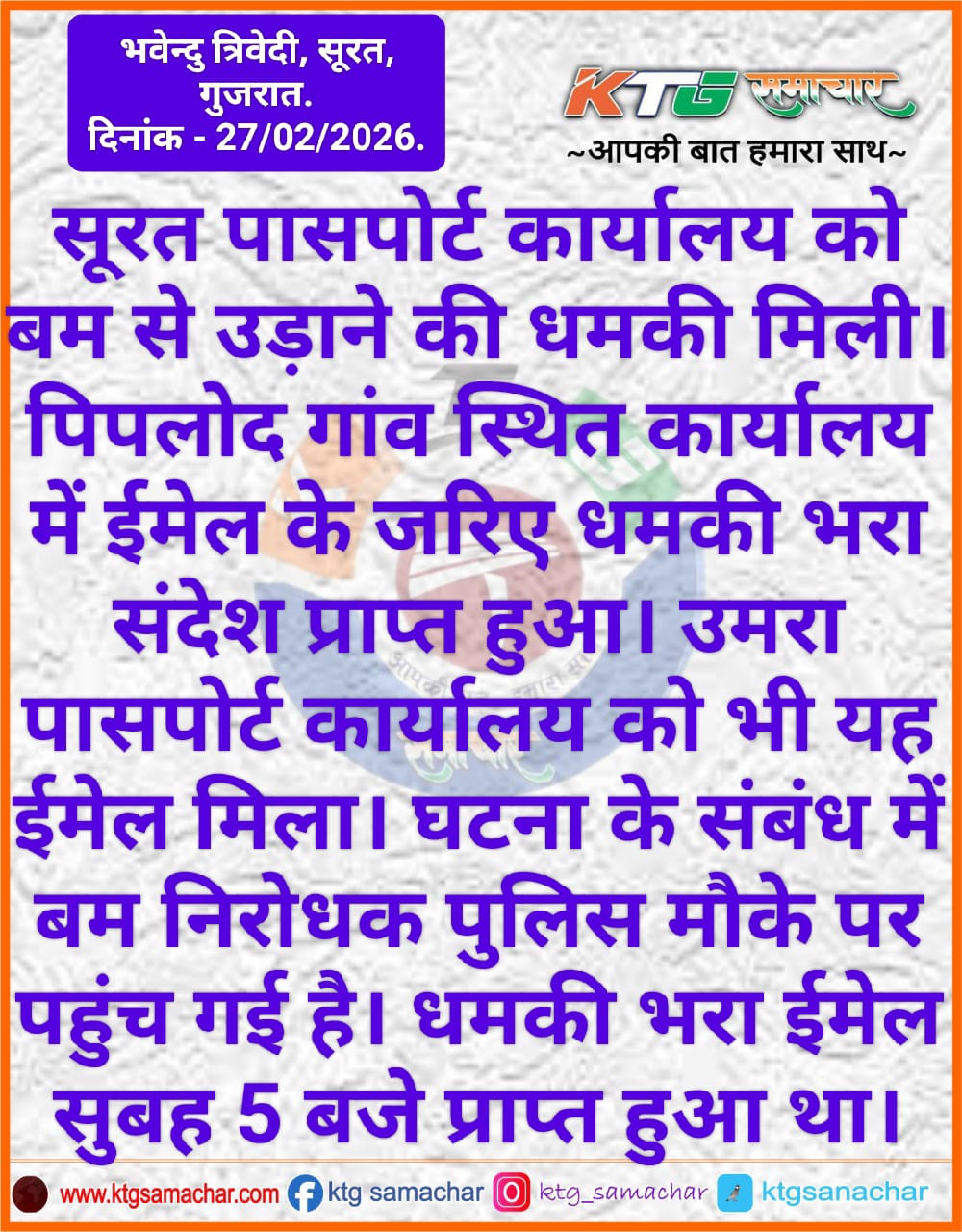 सूरत पासपोर्ट कार्यालय को बम से उड़ने की धमकी मिली।