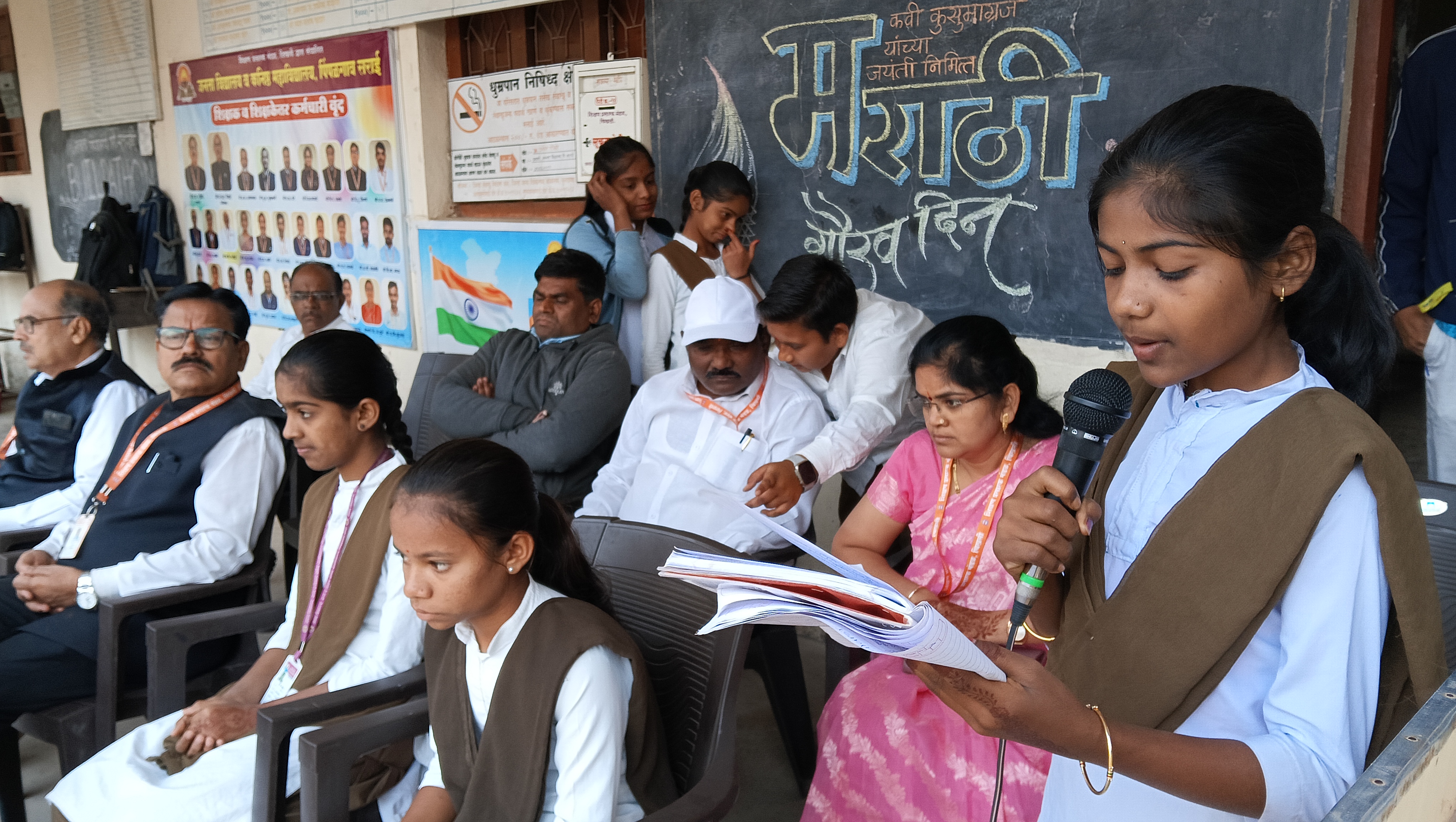 कार्यक्रमाच्या प्रमुख मार्गदर्शक कु. शारदा बऱ्हाटे यांनी आपल्या भाषणातून मराठी भाषा गौरव दिन हा कुसुमाग्रजांच्या जयंतीनिमित्त साजरा केला जातो, यामागील ऐतिहासिक व साहित्यिक पार्श्वभूमी विद्यार्थ्यांसमोर उलगडून सांगितली. कार्यक्रमाच्या अध्यक्षा कु. प्रगती शिंदे यांनी मराठी साहित्यातील विविध नामवंत साहित्यिकांचा परिचय करून देत विद्यार्थ्यांमध्ये भाषाभिमान जागवण्याचे आवाहन केले.