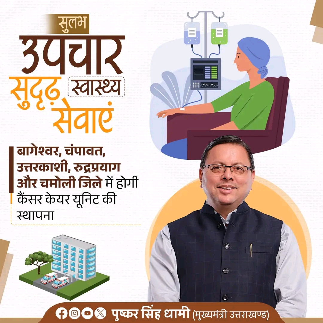 рдкреБрд╖реНрдХрд░ рд╕рд┐рдВрд╣ рдзрд╛рдореА рдХреЗ рдиреЗрддреГрддреНрд╡ рдореЗрдВ рд░рд╛рдЬреНрдп рд╕рд░рдХрд╛рд░ рдиреЗ рд╕реБрд▓рдн рдЙрдкрдЪрд╛рд░ рдФрд░ рд╕реБрджреГрдврд╝ рд╕реНрд╡рд╛рд╕реНрдереНрдп рд╕реЗрд╡рд╛рдУрдВ рдХреЗ рд╕рдВрдХрд▓реНрдк рдХреЛ рдЖрдЧреЗ рдмрдврд╝рд╛рддреЗ рд╣реБрдП рдПрдХ рдорд╣рддреНрд╡рдкреВрд░реНрдг рдирд┐рд░реНрдгрдп рд▓рд┐рдпрд╛ рд╣реИред рдкреНрд░рджреЗрд╢ рдХреЗ рдкрд░реНрд╡рддреАрдп рдЬрд┐рд▓реЛрдВ тАФ рдмрд╛рдЧреЗрд╢реНрд╡рд░, рдЪрдВрдкрд╛рд╡рдд, рдЙрддреНрддрд░рдХрд╛рд╢реА, рд░реБрджреНрд░рдкреНрд░рдпрд╛рдЧ рдФрд░ рдЪрдореЛрд▓реА тАФ рдореЗрдВ рдХреИрдВрд╕рд░ рдХреЗрдпрд░ рдпреВрдирд┐рдЯ рд╕реНрдерд╛рдкрд┐рдд рдХреА рдЬрд╛рдПрдВрдЧреАред