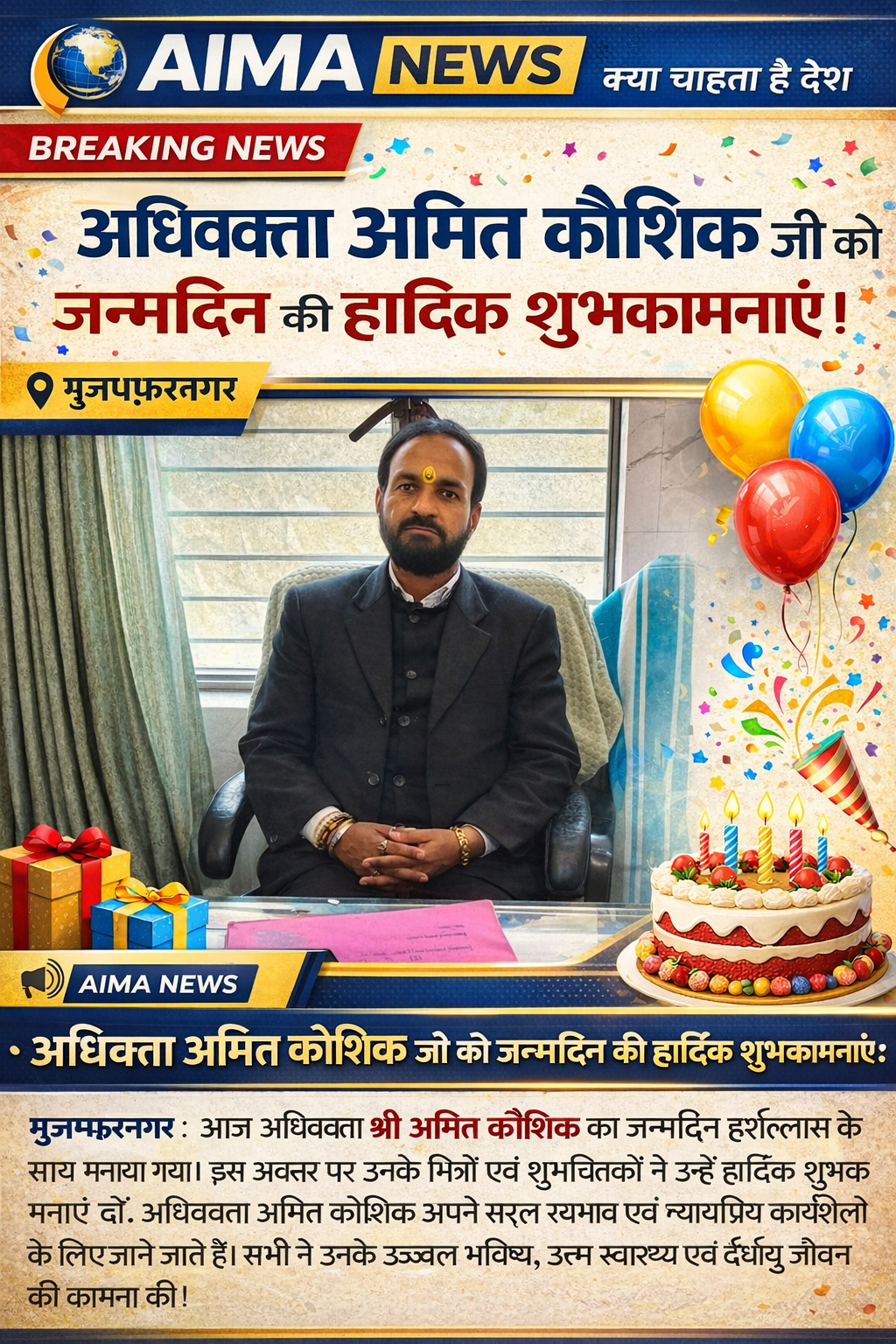 अधिवक्ता अमित कौशिक जी को जन्मदिन की हार्दिक शुभकामनाएं।