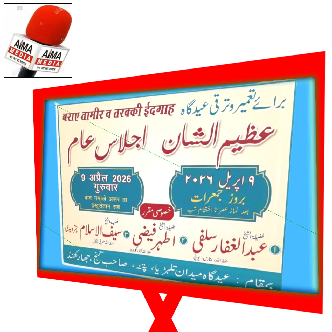 तलबडिया (पतना) स्थित ईदगाह मैदान में 9 अप्रैल 2026, गुरुवार को मरम्मत व तरक्की-ए-ईदगाह के उद्देश्य से एक अज़ीम-उश-शान आम जलसा का आयोजन किया जा रहा है। यह कार्यक्रम नमाज़-ए-असर व इशा के बाद शुरू होगा। आयोजन समिति ने क्षेत्रवासियों से बड़ी संख्या में शामिल होकर कार्यक्रम को सफल बनाने की अपील की है।