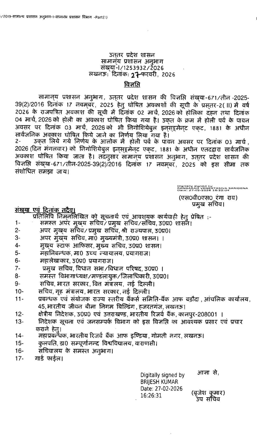 ब्रेकिंग अपडेट्स यूपी में होली की छुट्टी का नया आदेश हुआ जारी......