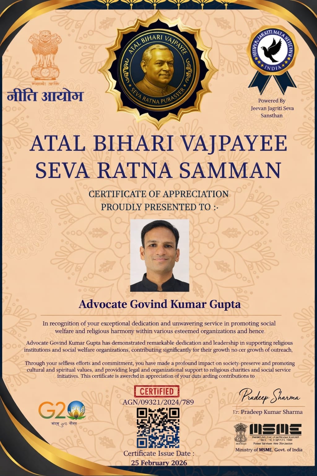 एडवोकेट गोविंद गुप्ता को मिला राष्ट्रीय ‘अटल बिहारी वाजपेई सेवा रत्न सम्मान’ – समाज सेवा में नई मिसाल