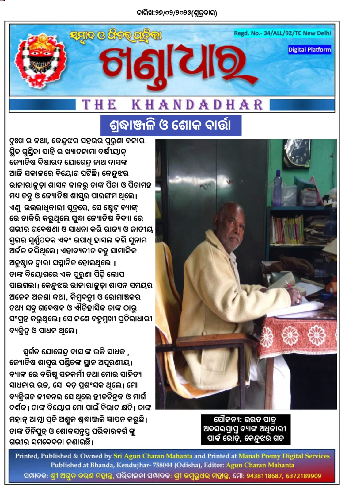 କେନ୍ଦୁଝର:୨୭/୦୨ (ଖଣ୍ଡାଧାର ନିଉଜ) ଦୁଃଖ ର କଥା, କେନ୍ଦୁଝର ସହରର ପୁରୁଣା ବଜାର ସ୍ଥିତ ଗୁଣ୍ଡିଚା ସାହି ର ଖ୍ୟାତନାମା ବର୍ଷୀୟାନ୍ ଜ୍ୟୋତିଷ ଵିଷାରଦ ଯୋଗେନ୍ଦ୍ର ନାଥ ଦାସଙ୍କ ଆଜି ସକାଳେ ବିୟୋଗ ଘଟିଛି । କେନ୍ଦୁଝର ରାଜାରାଜୁଡ଼ା ଶାସନ କାଳରୁ ତାଙ୍କ ପିତା ଓ ପିତାମହ ମଧ୍ୟ ତନ୍ତ୍ର ଓ ଜ୍ୟୋତିଷ ଶାସ୍ତ୍ରର ପାରଙ୍ଗମ ଥିଲେ।