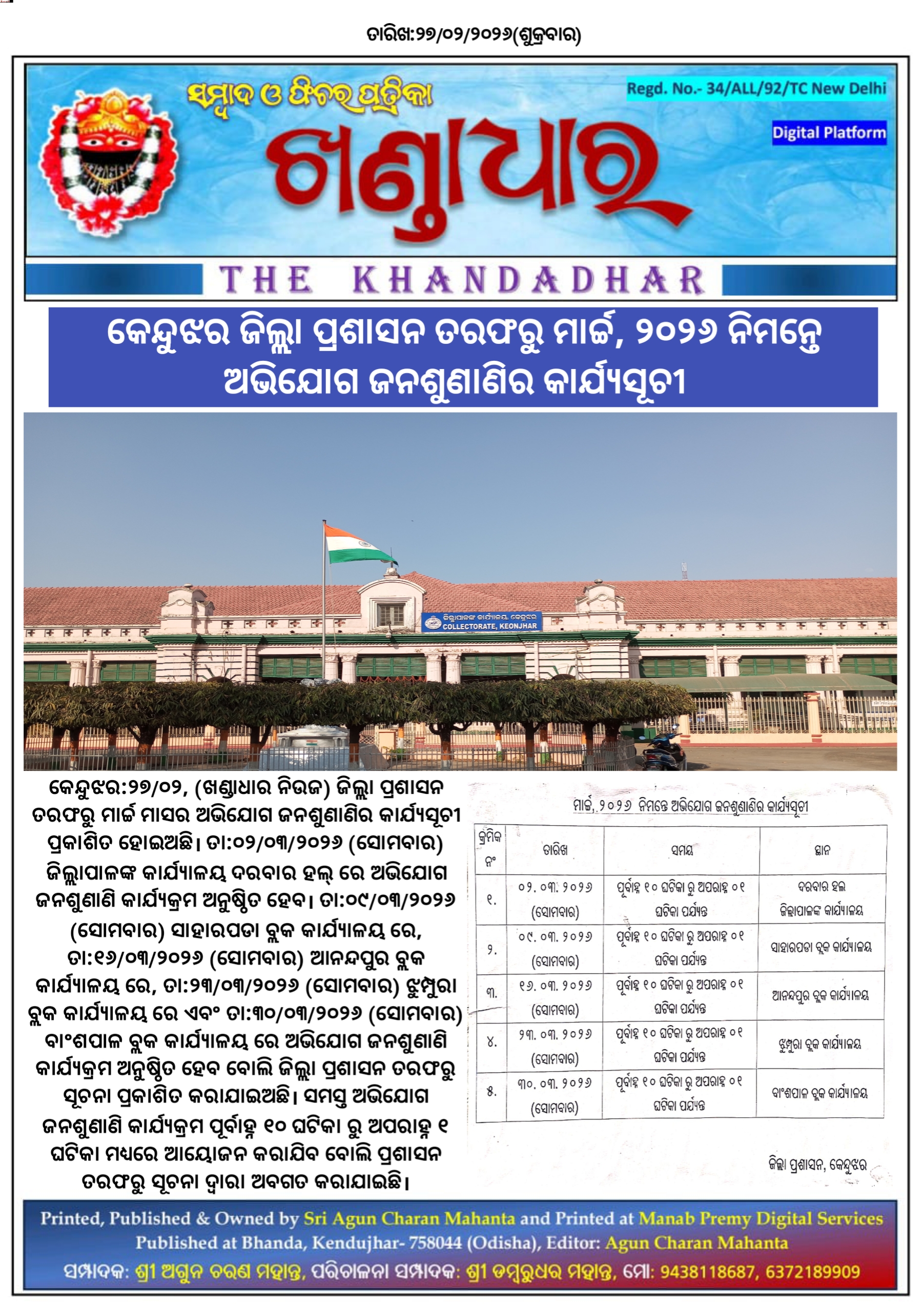 କେନ୍ଦୁଝର ଜିଲ୍ଲା ପ୍ରଶାସନ ତରଫରୁ ମାର୍ଚ୍ଚ, ୨୦୨୬ ନିମନ୍ତେ ଅଭିଯୋଗ ଜନଶୁଣାଣିର କାର୍ଯ୍ୟସୂଚୀ।