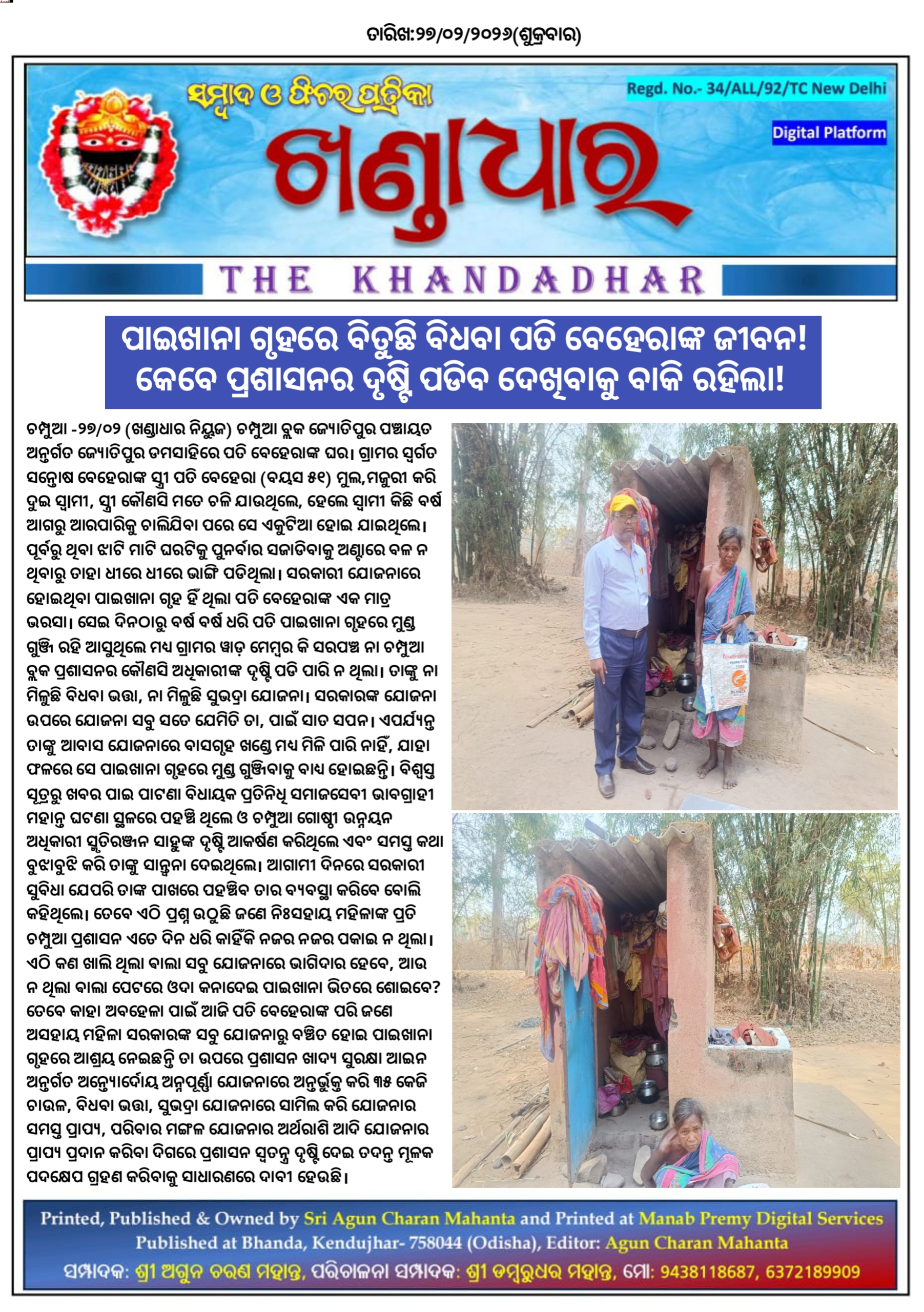 ହେବେ,ଆଉ ନ ଥିଲା ଵାଲା ପେଟରେ ଓଦା କନାଦେଇ ପାଇଖାନା ଭିତରେ ଶୋଇବେ? ତେବେ କାହା ଅବହେଳା ପାଇଁ ଆଜି ପତି ବେହେରାଙ୍କ ପରି ଜଣେ ଅସହାୟ ମହିଳା ସରକାରଙ୍କ ସବୁ ଯୋଜନାରୁ ବଞ୍ଚିତ ହୋଇ ପାଇଖାନା ଗୃହରେ ଆଶ୍ରୟ ନେଇଛନ୍ତି ତା ଉପରେ ପ୍ରଶାସନ ଖାଦ୍ୟ ସୁରକ୍ଷା ଆଇନ ଅନ୍ତର୍ଗତ ଅନ୍ତ୍ୟୋର୍ଦୋୟ ଅନ୍ନପୂର୍ଣ୍ଣା ଯୋଜନାରେ ଅନ୍ତର୍ଭୁକ୍ତ କରି ୩୫ କେଜି ଚାଉଳ,ବିଧବା ଭତ୍ତା, ସୁଭଦ୍ରା ଯୋଜନାରେ ସାମିଲ କରି ଯୋଜନାର ସମସ୍ତ ପ୍ରାପ୍ୟ ,ପରିବାର ମଙ୍ଗଳ ଯୋଜନାର ଅର୍ଥରାଶି ଆଦି ଯୋଜନାର ପ୍ରାପ୍ୟ ପ୍ରଦାନ କରିବା ଦିଗରେ ପ୍ରଶାସନ ସ୍ୱତନ୍ତ୍ର ଦୃଷ୍ଟି ଦେଇ ତଦନ୍ତ ମୂଳକ ପଦକ୍ଷେପ ଗ୍ରହଣ କରିବାକୁ ସାଧାରଣରେ ଦାବୀ ହେଉଛି।