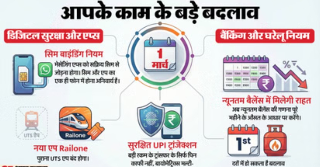 1 मार्च 2026 से आम लोगों की रोजमर्रा की जिंदगी से जुड़े कई महत्वपूर्ण नियम लागू होने जा रहे हैं। इन बदलावों का असर मोबाइल उपयोग, रेलवे टिकट बुकिंग, बैंक खाते और डिजिटल भुगतान जैसे क्षेत्रों पर पड़ेगा। आइए आसान भाषा में समझते हैं क्या-क्या बदल रहा है:हर बार की तरह इस महीने भी 1 मार्च 2026 से कई नियमों में बदलाव देखने को मिल सकते हैं। महीने की पहली तारीख अक्सर नीतिगत और प्रशासनिक परिवर्तनों के लिए अहम मानी जाती है, जिनका सीधा असर आम लोगों की दिनचर्या और जेब पर पड़ता है। आइए विस्तार से जानते हैं, किन नियमों में होने वाला है बड़ा बदलाव।