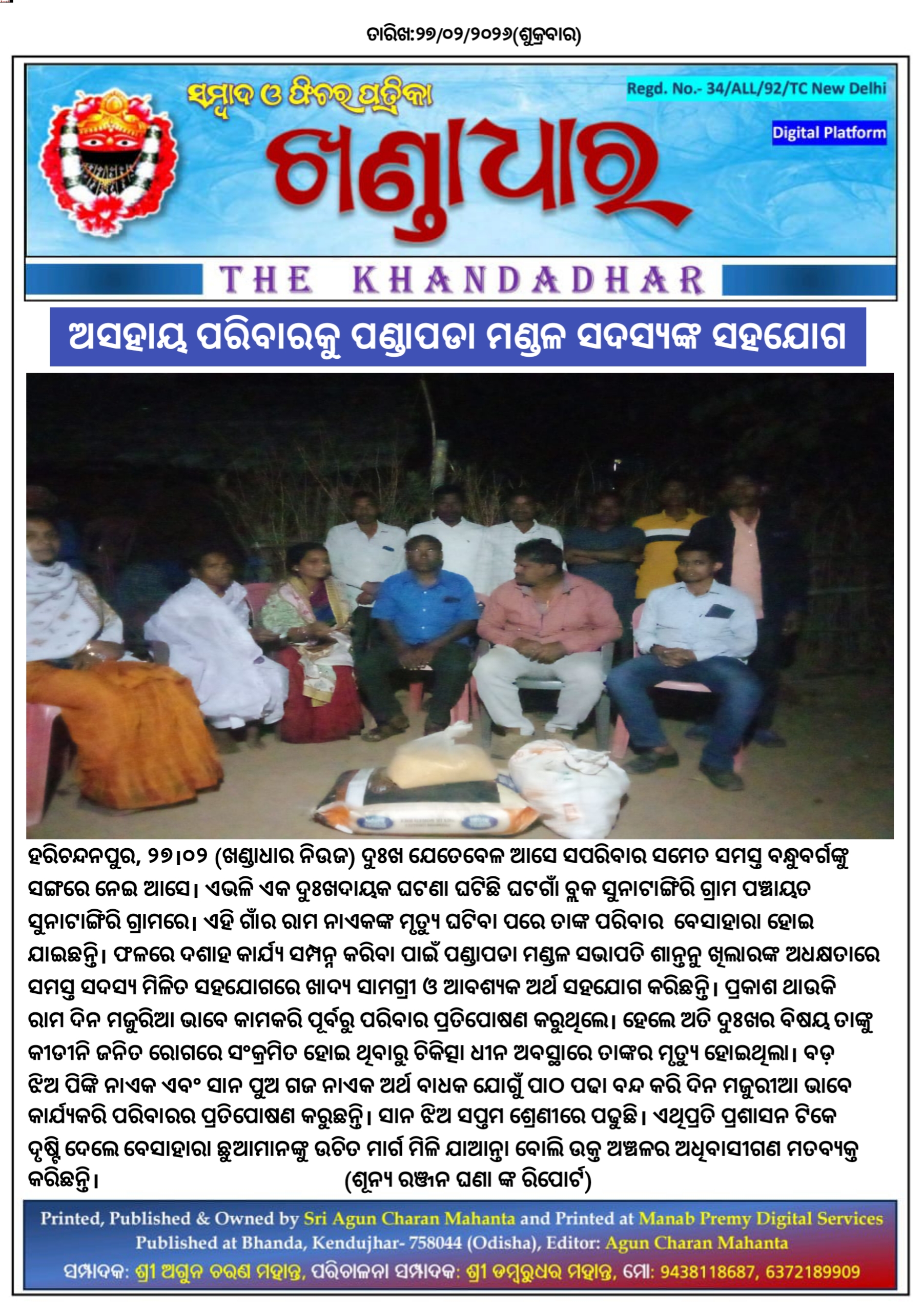 ହରିଚନ୍ଦନପୁର, ୨୭।୦୨ (ଖଣ୍ଡାଧାର ନିଉଜ) ଦୁଃଖ ଯେତେବେଳ ଆସେ ସପରିବାର ସମେତ ସମସ୍ତ ବନ୍ଧୁବର୍ଗଙ୍କୁ ସଙ୍ଗରେ ନେଇ ଆସେ। ଏଭଳି ଏକ ଦୁଃଖଦାୟକ ଘଟଣା ଘଟିଛି ଘଟଗାଁ ବ୍ଲକ ସୁନାଟାଙ୍ଗିରି ଗ୍ରାମ ପଞ୍ଚାୟତ ସୁନାଟାଙ୍ଗିରି ଗ୍ରାମରେ। ଏହି ଗାଁର ରାମ ନାଏକଙ୍କ ମୃତ୍ୟୁ ଘଟିବା ପରେ ତାଙ୍କ ପରିବାର ବେସାହାରା ହୋଇ ଯାଇଛନ୍ତି। ଫଳରେ ଦଶାହ କାର୍ଯ୍ୟ ସମ୍ପନ୍ନ କରିବା ପାଇଁ ପଣ୍ଡାପଡା ମଣ୍ଡଳ ସଭାପତି ଶାନ୍ତନୁ ଖିଲାରଙ୍କ ଅଧକ୍ଷତାରେ ସମସ୍ତ ସଦସ୍ୟ ମିଳିତ ସହଯୋଗରେ ଖାଦ୍ୟ ସାମଗ୍ରୀ ଓ ଆବଶ୍ଯକ ଅର୍ଥ ସହଯୋଗ କରିଛନ୍ତି। ପ୍ରକାଶ ଥାଉକି ରାମ ଦିନ ମଜୁରିଆ ଭାବେ କାମକରି ପୂର୍ବରୁ ପରିବାର ପ୍ରତିପୋଷଣ କରୁଥିଲେ। ହେଲେ ଅତି ଦୁଃଖର ବିଷୟ ତାଙ୍କୁ କୀଡୀନି ଜନିତ ରୋଗରେ ସଂକ୍ରମିତ ହୋଇ ଥିବାରୁ ଚିକିତ୍ସା ଧୀନ ଅବସ୍ଥାରେ ତାଙ୍କର ମୃତ୍ୟୁ ହୋଇଥିଲା। ବଡ଼ ଝିଅ ପିଙ୍କି ନାଏକ ଏବଂ ସାନ ପୁଅ ଗଜ ନାଏକ ଅର୍ଥ ବାଧକ ଯୋଗୁଁ ପାଠ ପଢା ବନ୍ଦ କରି ଦିନ ମଜୁରୀଆ ଭାବେ କାର୍ଯ୍ୟକରି ପରିବାରର ପ୍ରତିପୋଷଣ କରୁଛନ୍ତି। ସାନ ଝିଅ ସପ୍ତମ ଶ୍ରେଣୀରେ ପଢୁଛି। ଏଥିପ୍ରତି ପ୍ରଶାସନ ଟିକେ ଦୃଷ୍ଟି ଦେଲେ ବେସାହାରା ଛୁଆମାନଙ୍କୁ ଉଚିତ ମାର୍ଗ ମିଳି ଯାଆନ୍ତା ବୋଲି ଉକ୍ତ ଅଞ୍ଚଳର ଅଧିବାସୀଗଣ ମତବ୍ୟକ୍ତ କରିଛନ୍ତି।