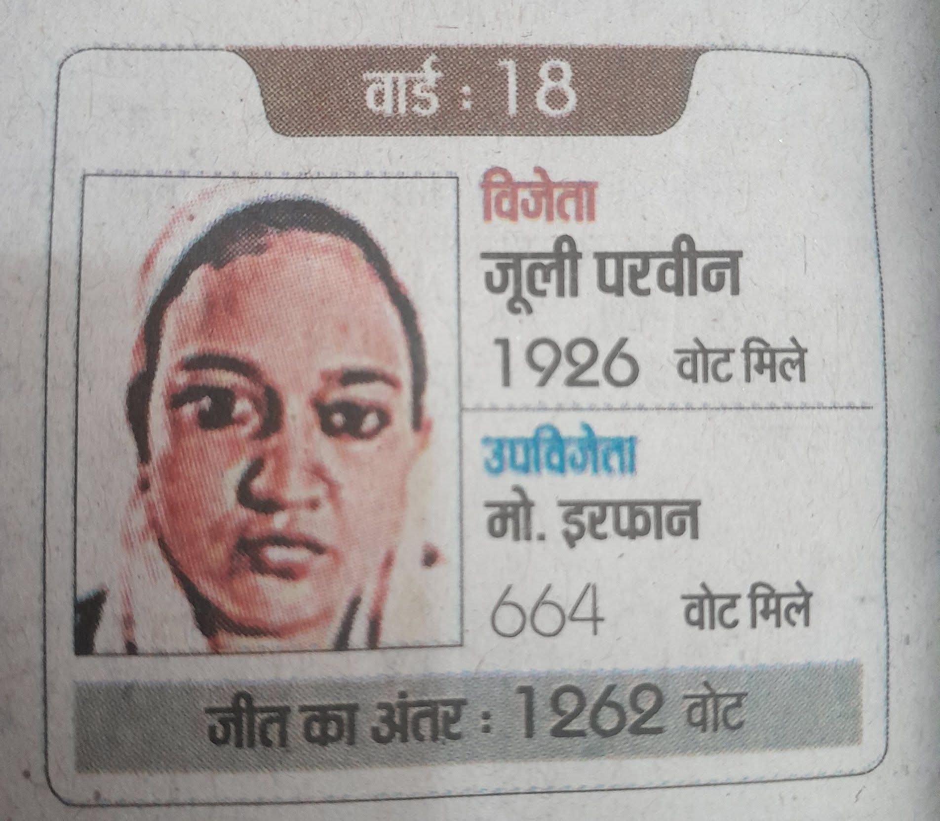 वार्ड संख्या 18 से लगभग 1200 वोटो से जूली परवीन ने जीत दर्ज की
