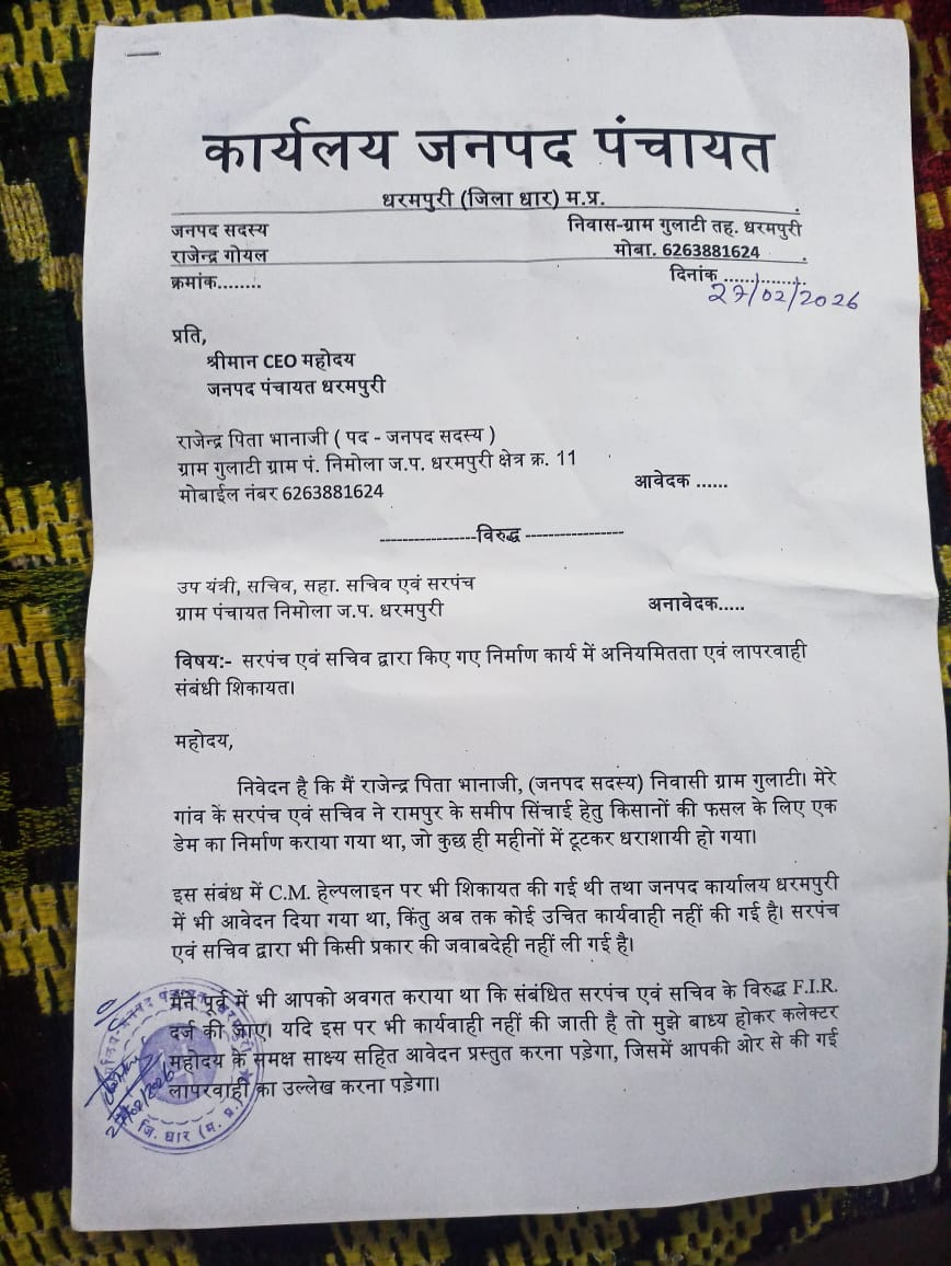 अभिषेक चौधरी (जिला पंचायत सीईओ, धार) ने दूरभाष पर बताया कि वे स्वयं मौके पर पहुंचे थे और प्रारंभिक निरीक्षण में कमियां पाई गई हैं। जांच के लिए टीम गठित कर दी गई है और रिपोर्ट के आधार पर दोषियों पर कार्रवाई की जाएगी।