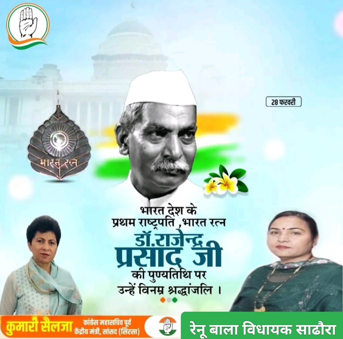 कपुरी :- हल्का सधौरा विधायक मैडम रेणु बाला जी नें डा. राजेंद्र प्रशाद जी को श्रद्धांजलि दीं, " ''जो बात सिद्धांत में गलत है, वह बात व्यवहार में भी सही नहीं है।" भारत के प्रथम राष्ट्रपति एवं महान स्वतंत्रता सेनानी 'भारत रत्न' डॉ. राजेन्द्र प्रसाद जी की पुण्यतिथि पर उन्हें सादर नमन ! विनम्र श्रद्धांजलि !