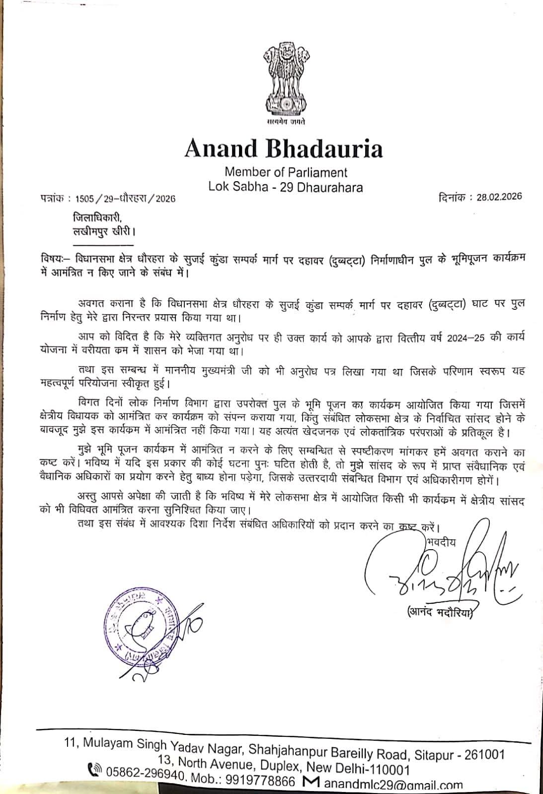 लखीमपुर खीरी। धौरहरा लोकसभा क्षेत्र से समाजवादी पार्टी के सांसद आनंद भदौरिया ने अधिकारियों की कार्यशैली पर नाराजगी जताई है। आरोप है कि धौरहरा विधानसभा क्षेत्र के सुजईकुंडा रोड पर निर्मित पुलिया के उद्घाटन कार्यक्रम में उन्हें आमंत्रित नहीं किया गया।
