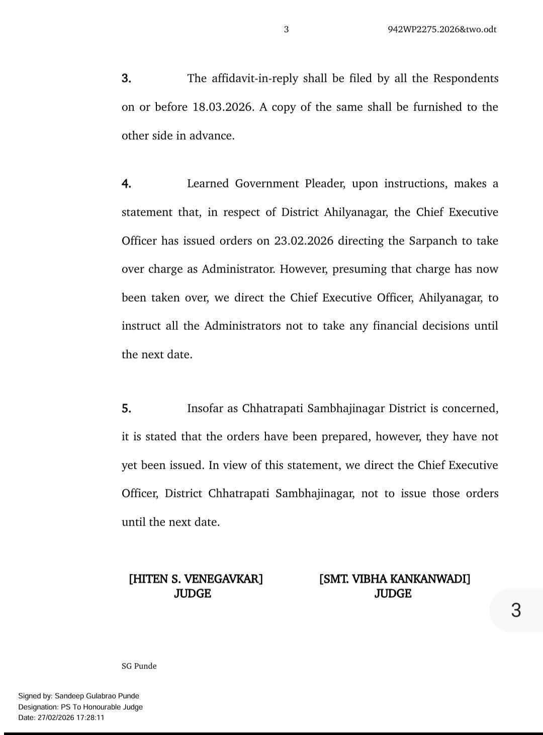 मा.उच्च न्यायालय औरंगाबाद खंडपीठाने जिल्हा परिषद अहिल्यानगर व जिल्हा परिषद छत्रपती संभाजीनगर येथील ग्रामपंचायतीमध्ये सरपंच यांना प्रशासक नियुक्तीस व आर्थिक निर्णय घेण्यास स्थगिती देण्यात आली.