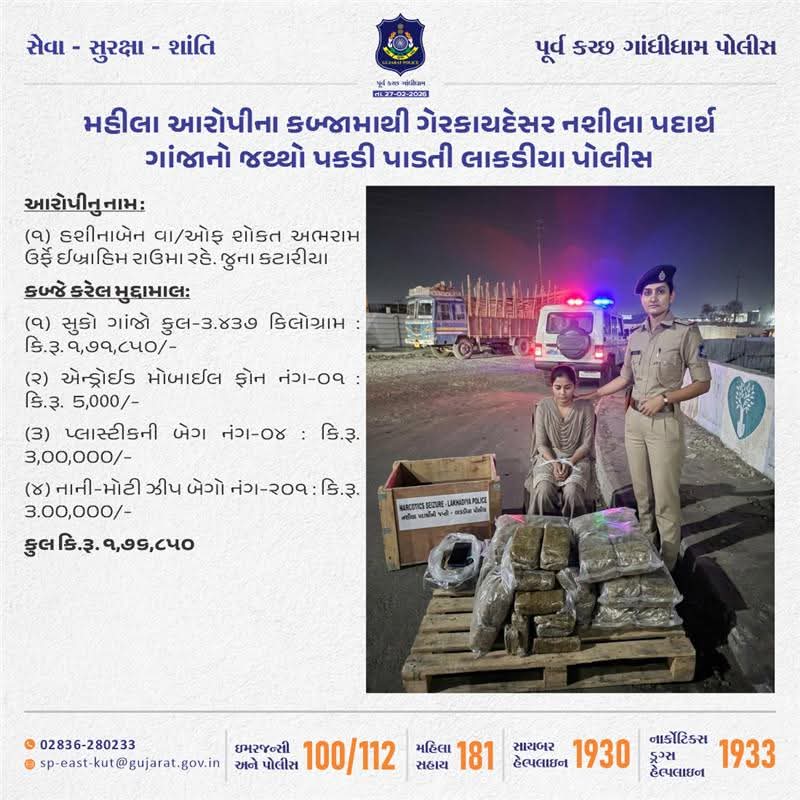 લાકડીયા પુર્વ કચ્છ પોલીસે નશીલા પદાર્થ ગાંજા સાથે મહિલા આરોપી ઝડપાઇ ગયેલ