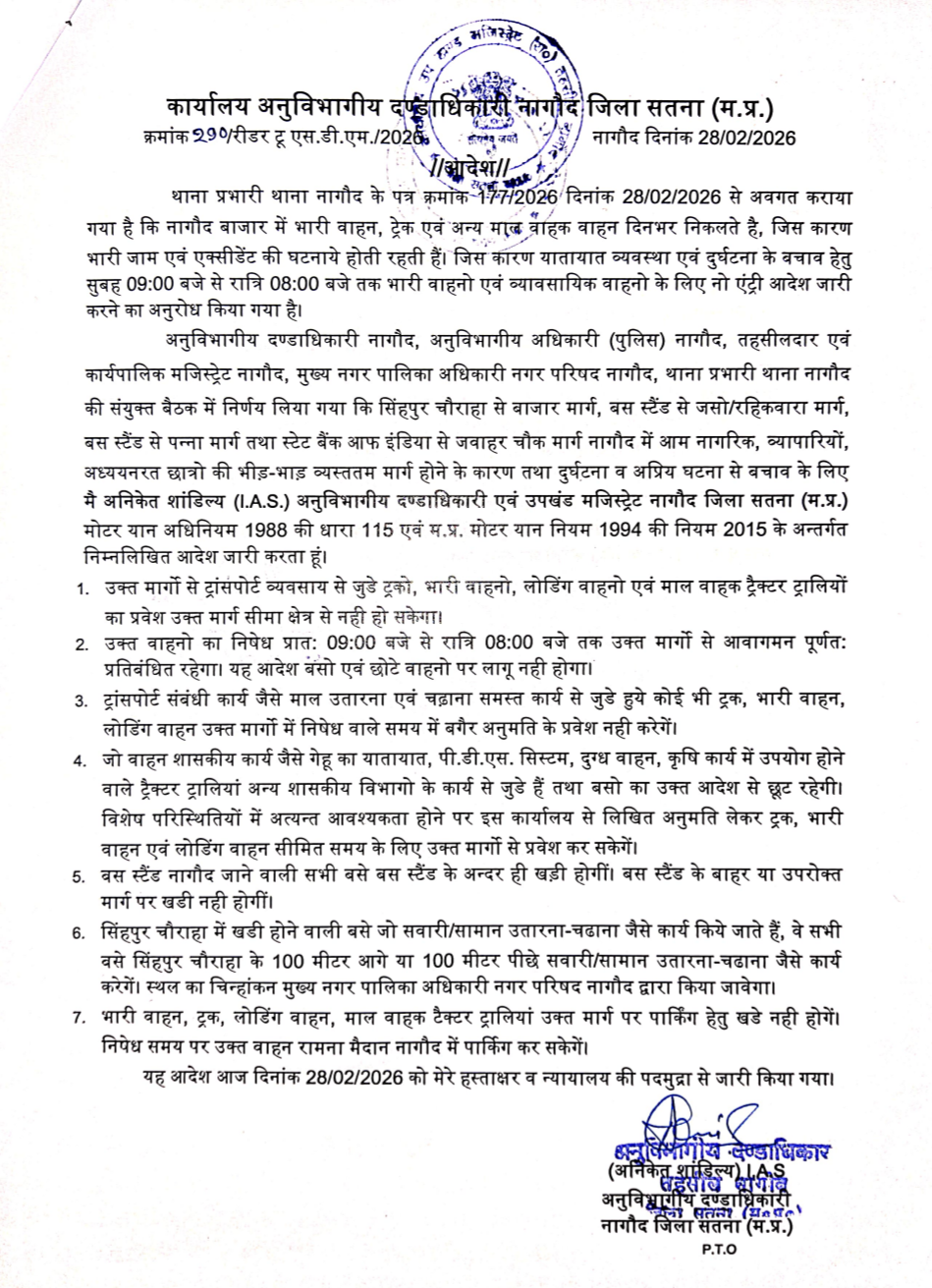 नागौद : अनुविभागीय दंडाधिकारी अनिकेत शांडिल्य ने जनता के हितों को ध्यान में रखते हुए शहर में भारी वाहनों के प्रवेश से संबंधित दिशा निर्देश जारी किए हैं एवं सुबह 9.00 बजे से रात्रि 8.00 बजे तक नो एंट्री जोन घोषित किया है। जारी पत्र के अनुसार सिंहपुर चौराहा से बाजार मार्ग , बस स्टैंड से जसो रहिकवारा मार्ग,बस स्टैंड से पन्ना मार्ग ,स्टैंड बैंक आफ इंडिया से जवाहर चौक मार्ग, में भारी वाहनों का तय सीमा में प्रवेश प्रतिबंधित रहेगा। साथ ही नागौद बस स्टैंड जाने वाली बसें सिर्फ बस स्टैंड में ही खड़ी होंगी और सिंहपुर चौराहा में खड़ी होने वाली बसें सवारी उतारने चढ़ाने और समान उतारने का कार्य चौराहें से 100 मीटर पहले या बाद में करेंगी जिसका स्थल नगर पालिका द्वारा निर्धारित किया जाएगा। भारी वाहन, मालवाहक, गैर कृषि कार्य के मालवाहक ट्रेक्टर ट्राली आदि उक्त मार्गों पर खड़े नहीं होंगे आवश्यकता पड़ने पर रामना मैदान में खड़े होंगे।